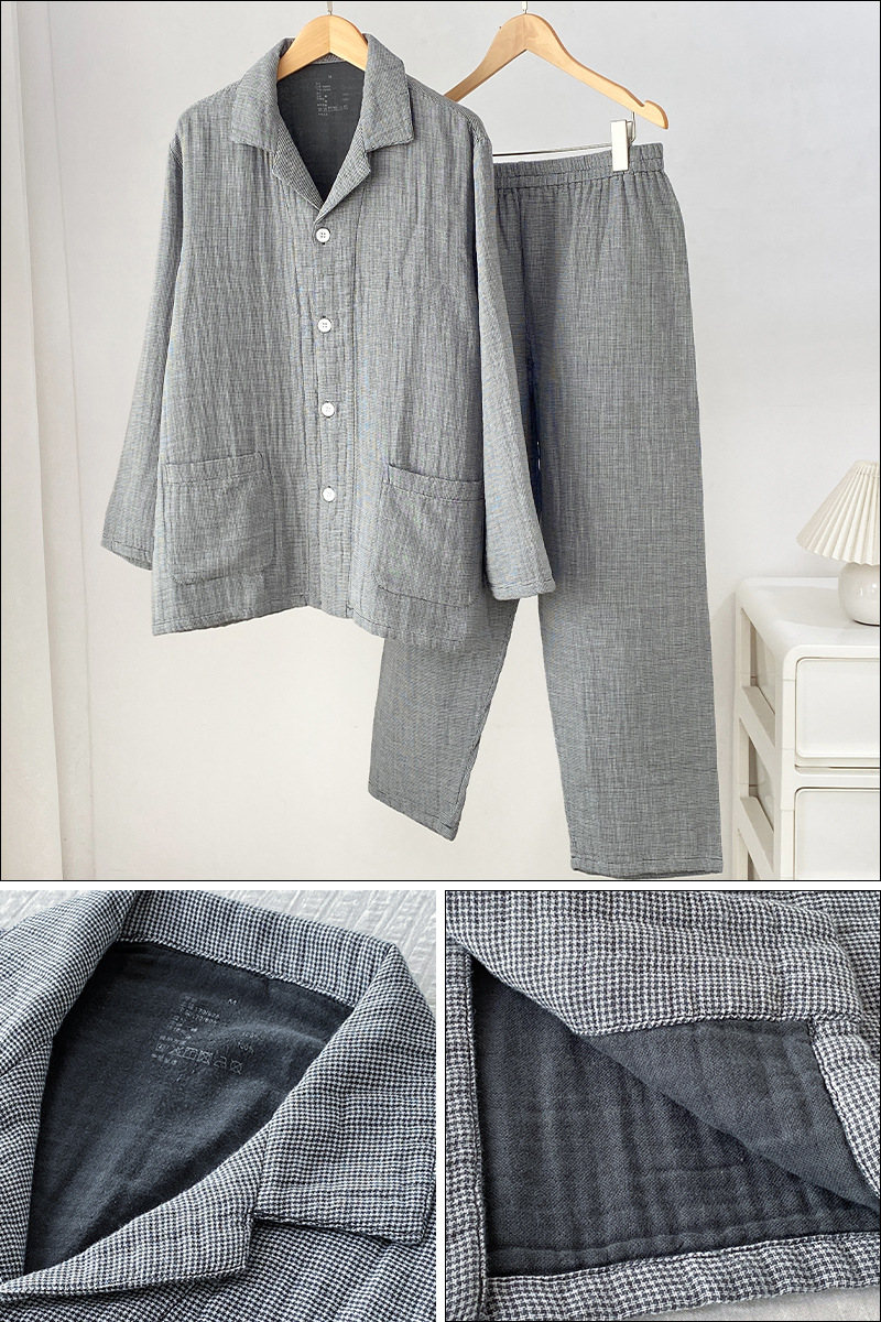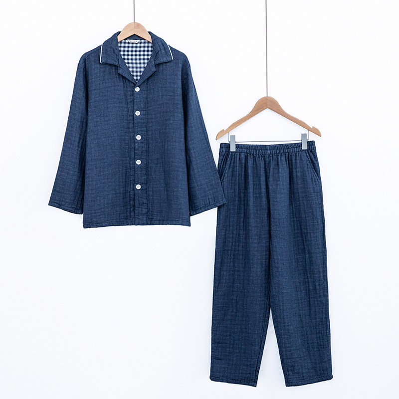 MUJI 일본식 Yimi Thickened Pure Cotton 4 층 거즈 파자마 남성과 여성의 땀 긴팔 홈 의류 가을과 겨울 세트스토어 가기