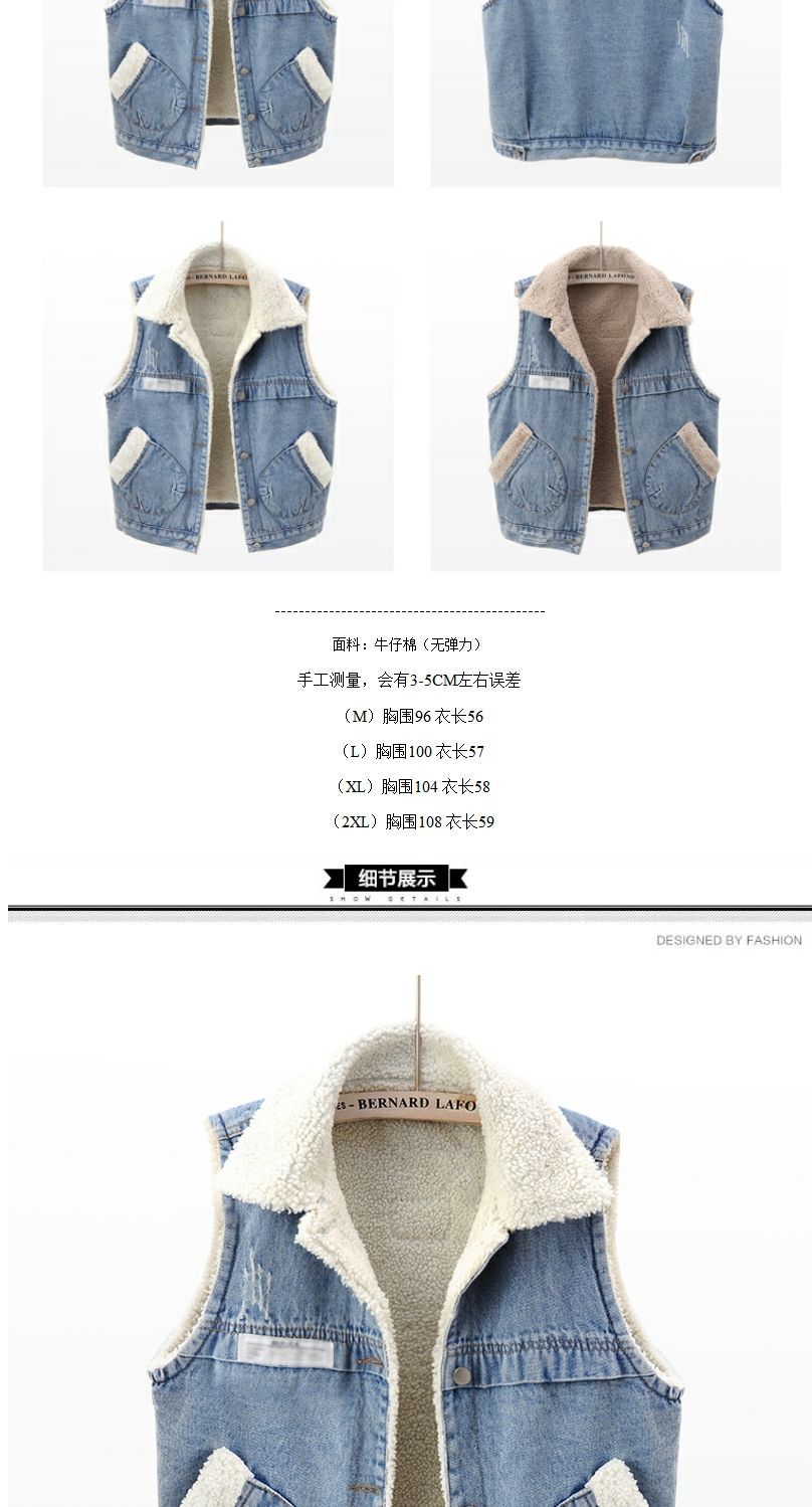 가을과 겨울 양모 기모 두꺼운 패치 데님 조끼 여성 느슨한 한국식 면화 조끼 조끼 양복 조끼