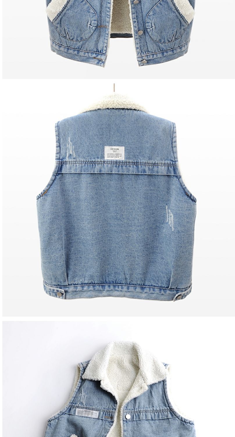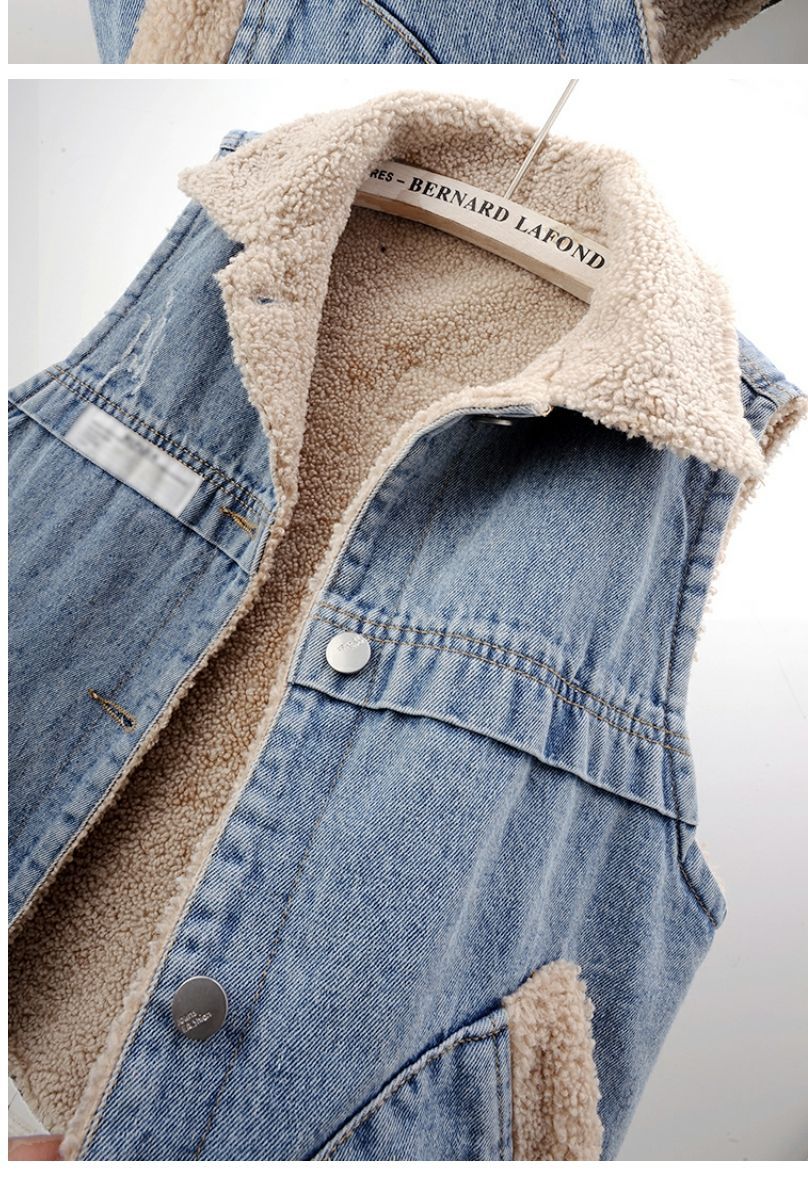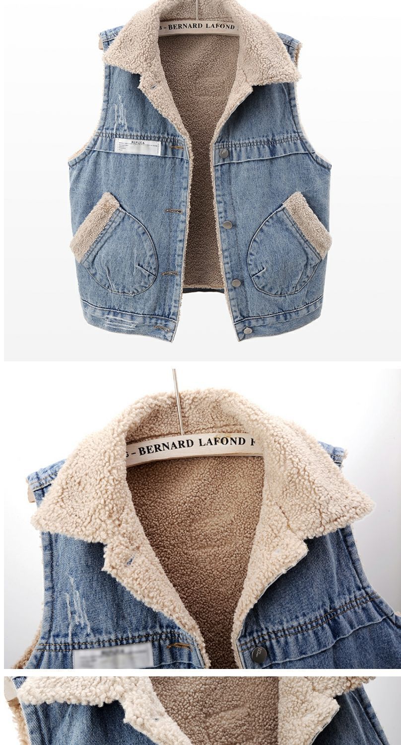 가을과 겨울 양모 기모 두꺼운 패치 데님 조끼 여성 느슨한 한국식 면화 조끼 조끼 양복 조끼스토어 가기