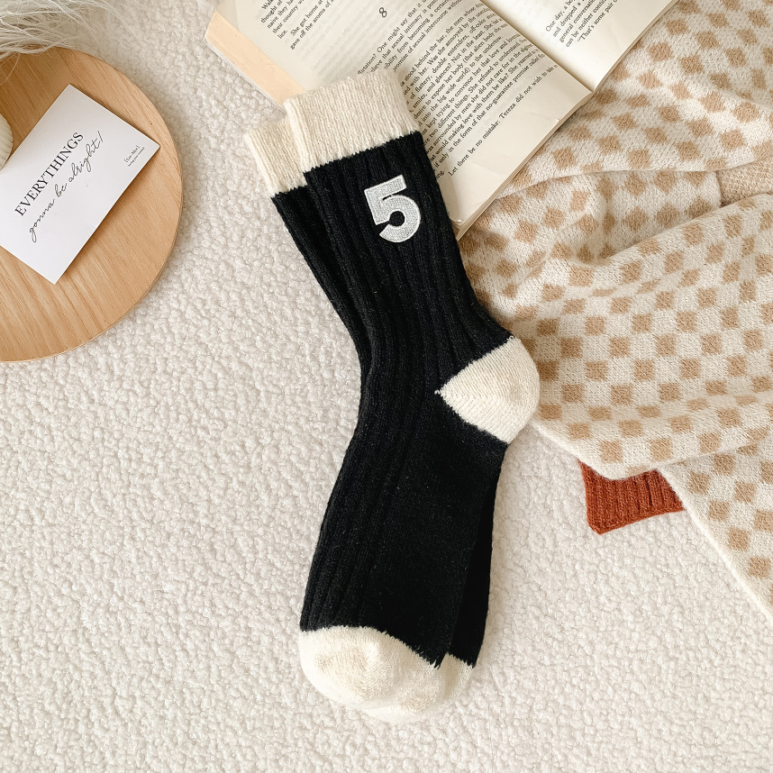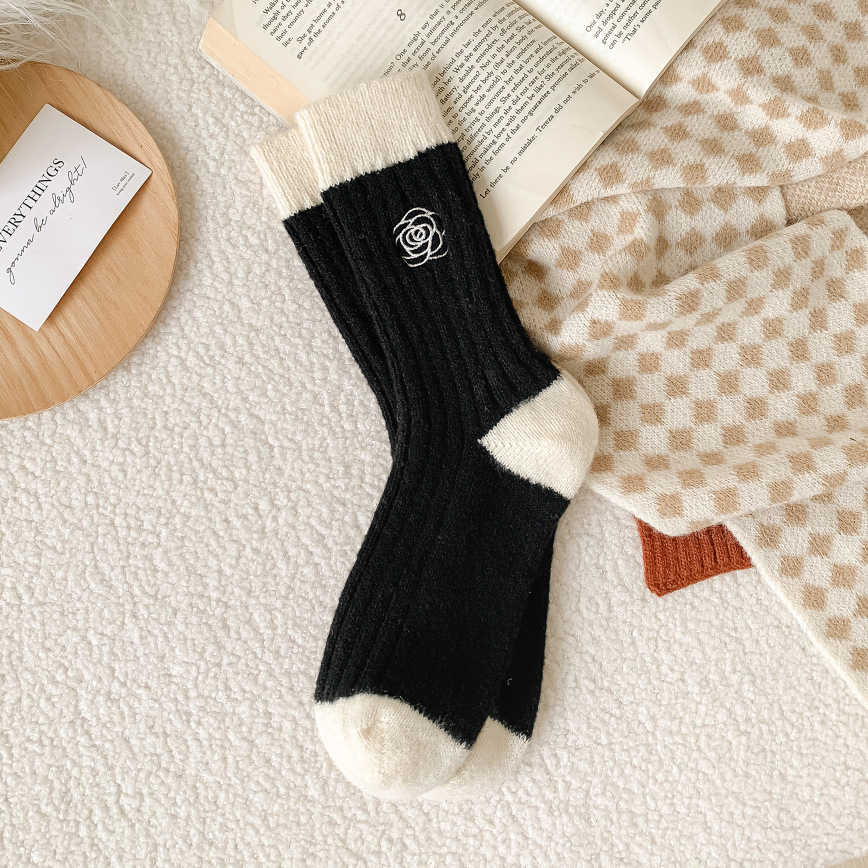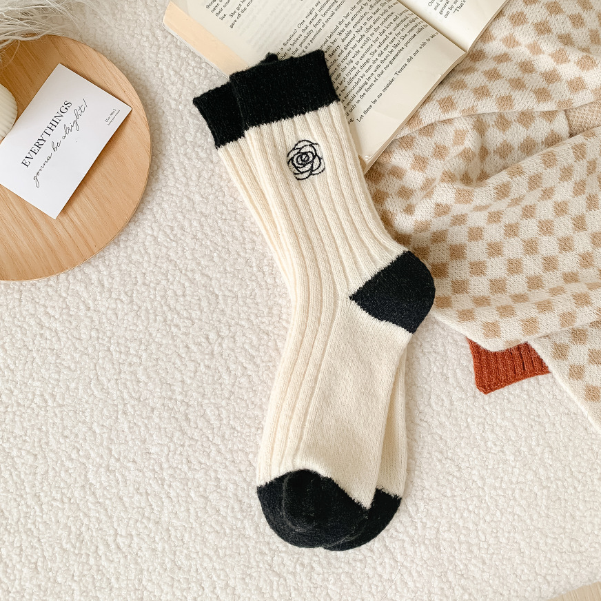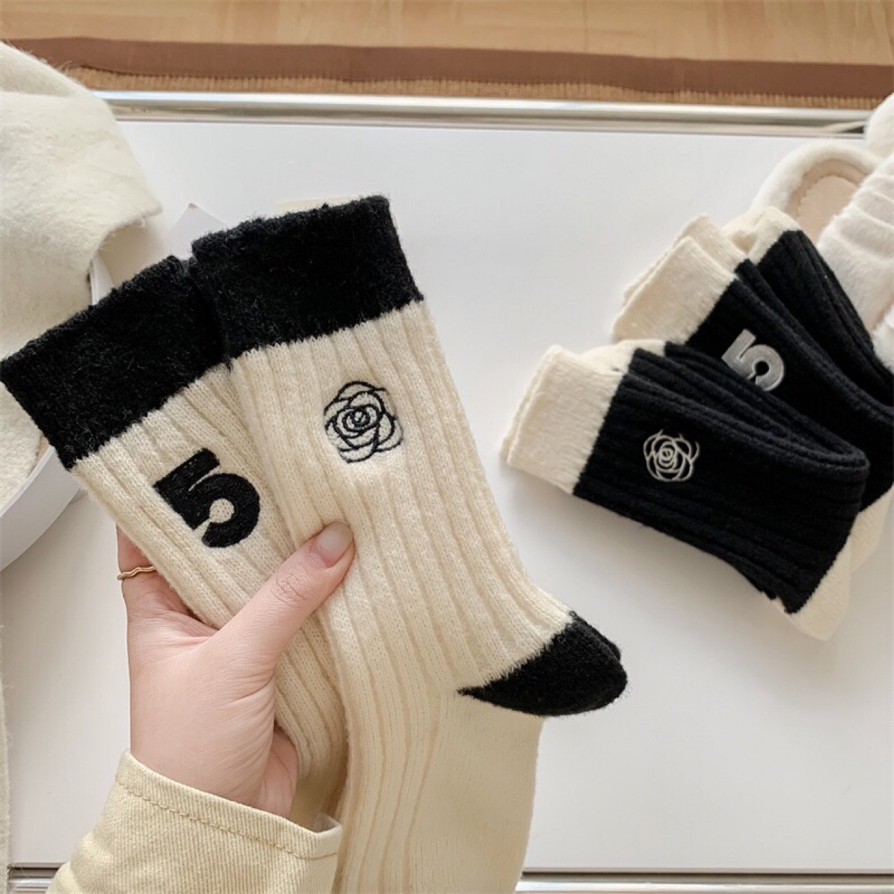 동백 자수 면화 양말 가을과 겨울 두꺼운 흑백 양말 여성 사슴 플러시 바닥 양말
