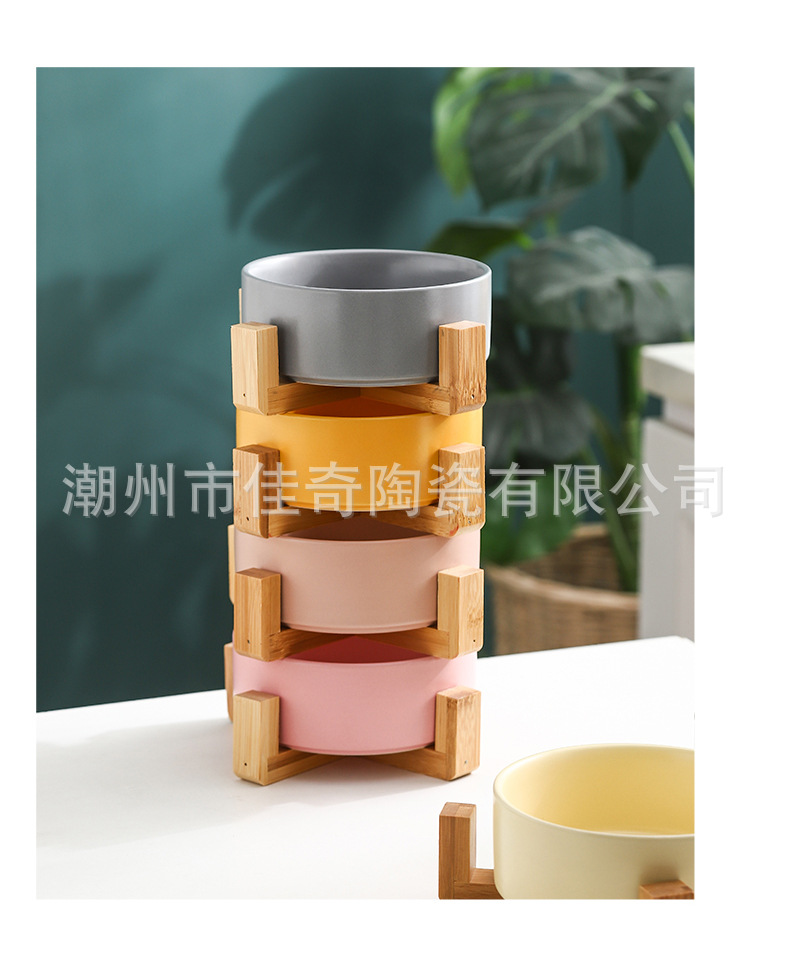 • 편평한 입 이중 그릇 + 나무 스탠드 - 핑크