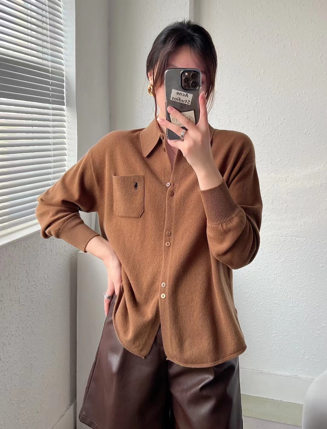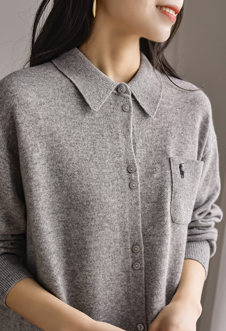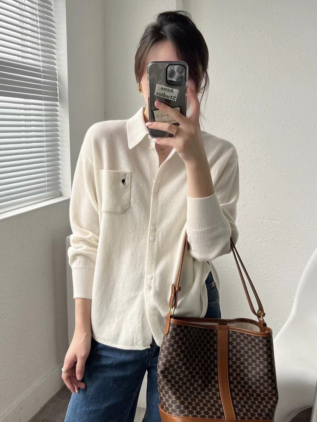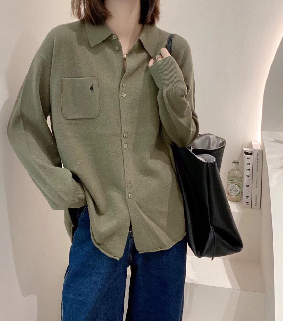50 울 혼방 니트 셔츠 여성용 포켓 자수 아크 밑단 폴로 넥 스웨터 2022 가을 긴 소매 셔츠스토어 가기
