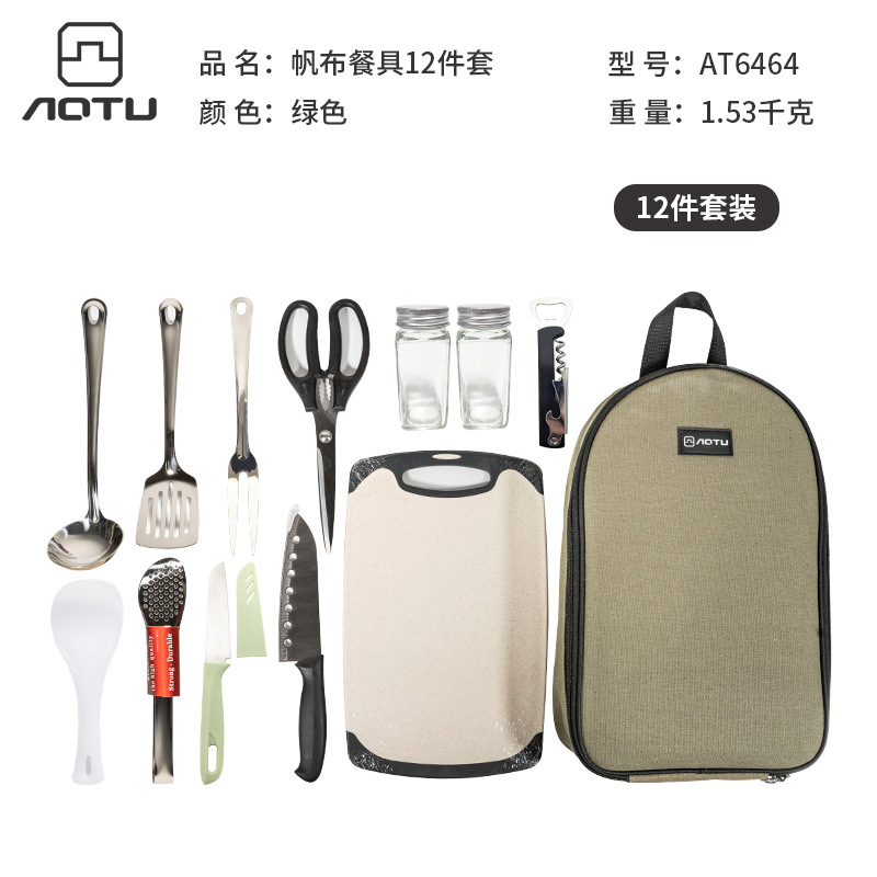 清单:菜刀*1,饭勺*1,菜板*1,开瓶器*1,玻璃瓶*2, 剪刀*1,汤勺*1,锅铲*1,夹子*1,水果刀*1,肉叉*1