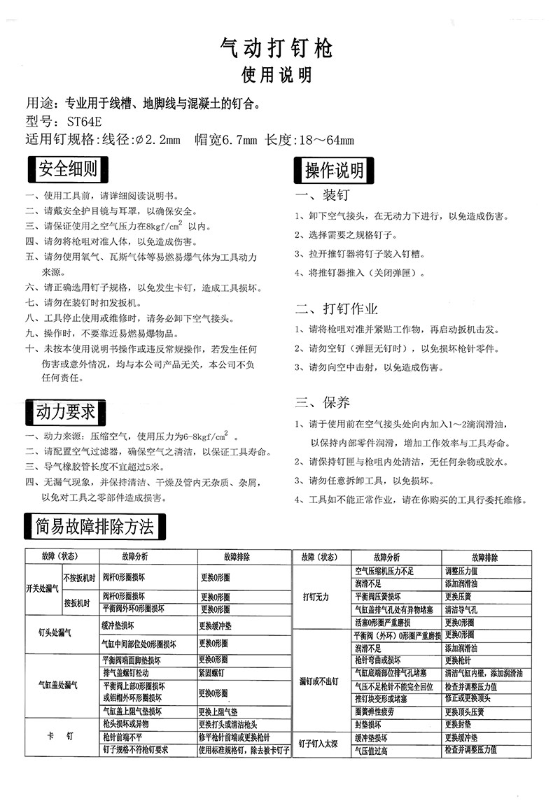 此产品为ST38  ST38C ST64E钢排钉枪,需要配备空压机 气管 接头 才可使用,
