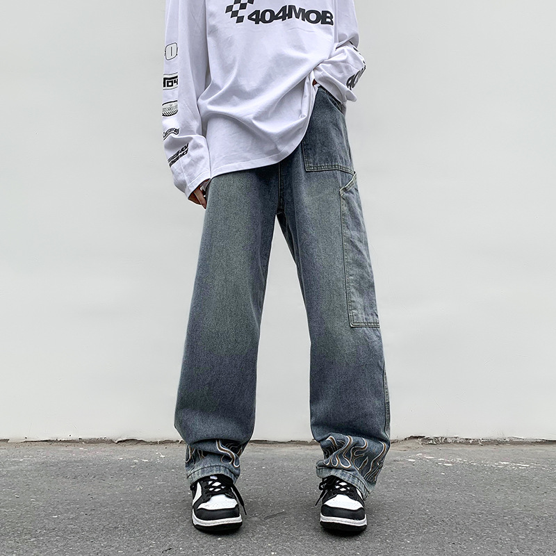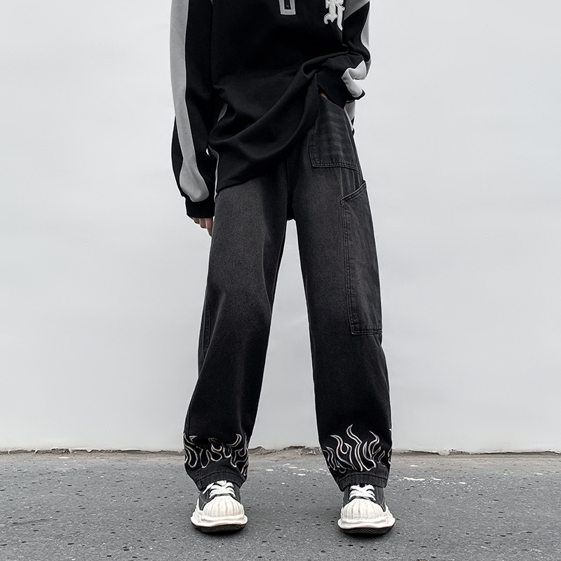 가을 겨울 청바지 남성 하라주쿠 스타일 홍콩 스타일 캐주얼 디자인 센스 힙합 학생 올매치 와이드 팬츠 트렌디 브랜드스토어 가기