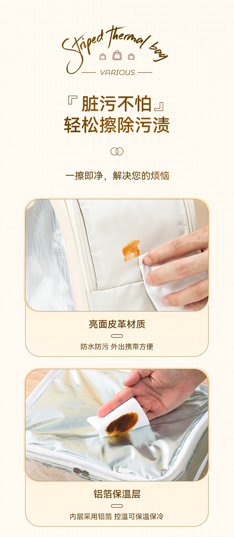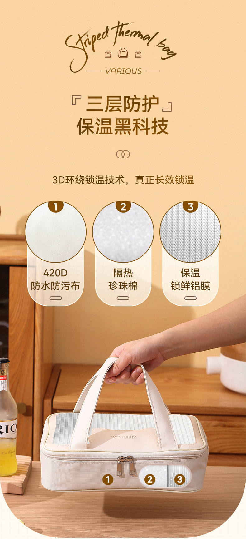 • 产品材质: 420D防水防污布、铝箔、珍珠棉、PVC条纹