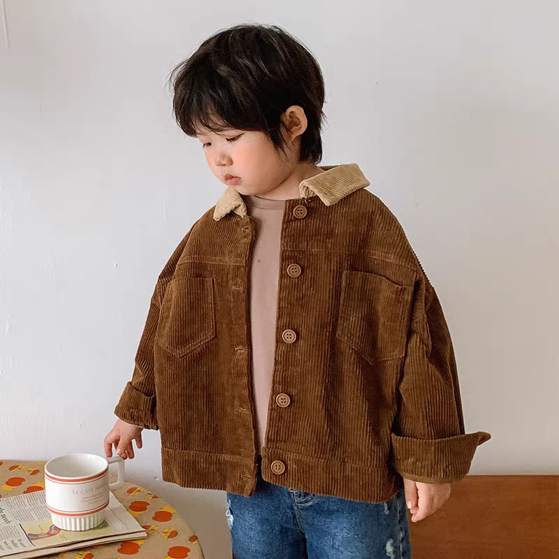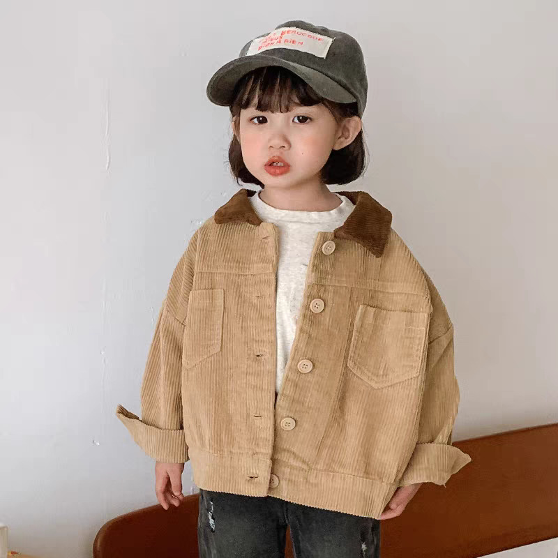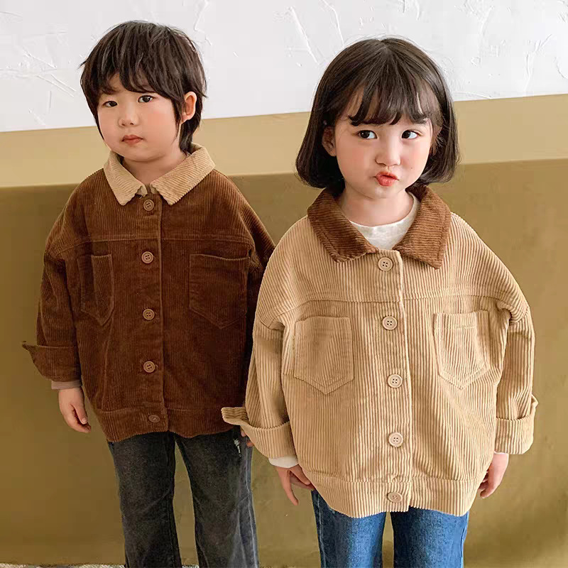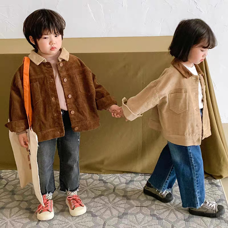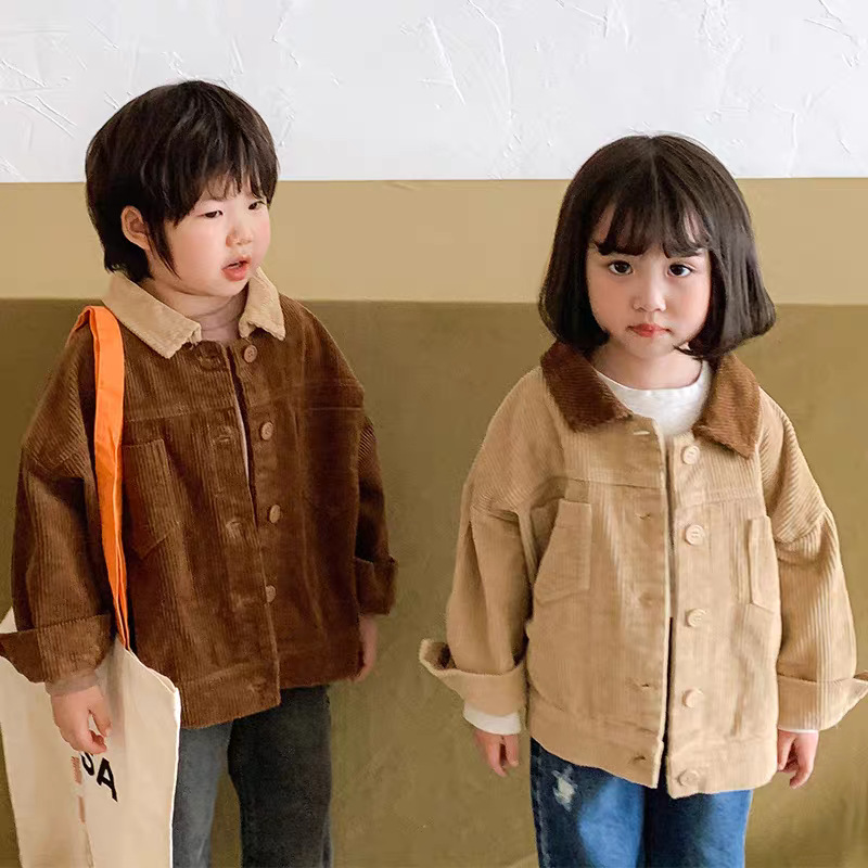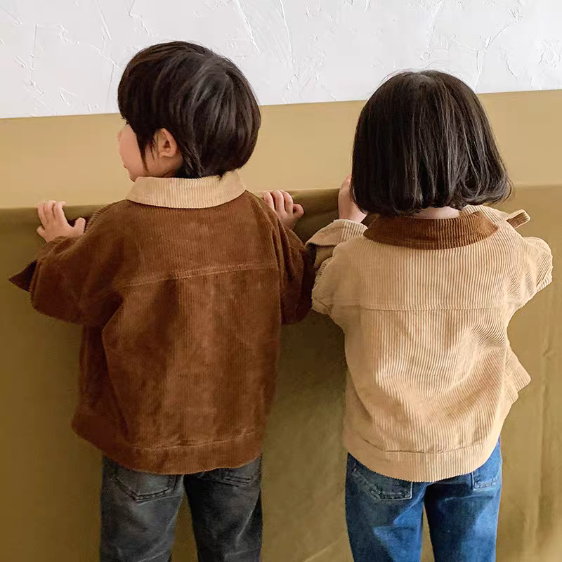 남성과 여성을 위한 심플한 복고풍 일본과 한국 스타일의 어린이 대비 색상 코듀로이 라펠 재킷, 루즈한 재킷, 가을 상의스토어 가기