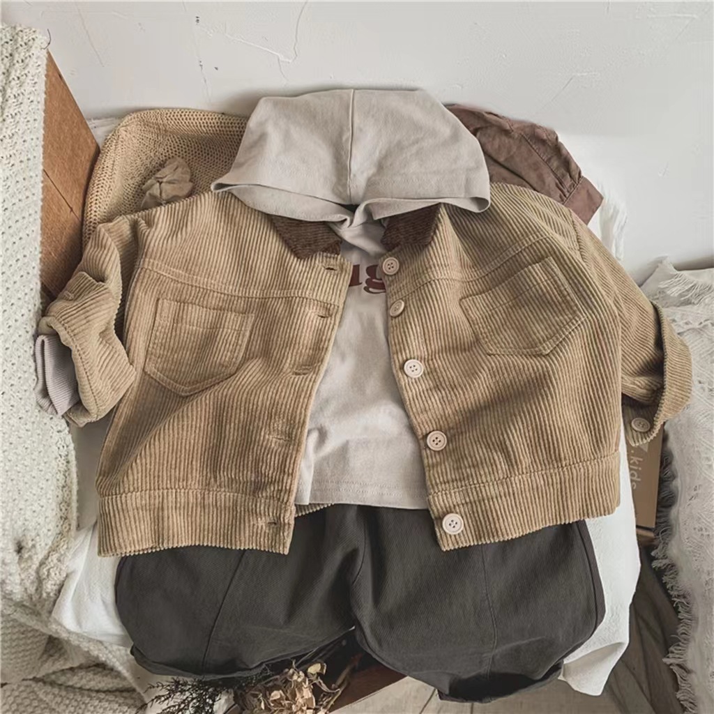 남성과 여성을 위한 심플한 복고풍 일본과 한국 스타일의 어린이 대비 색상 코듀로이 라펠 재킷, 루즈한 재킷, 가을 상의