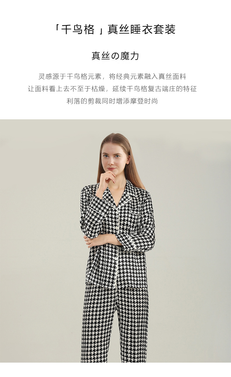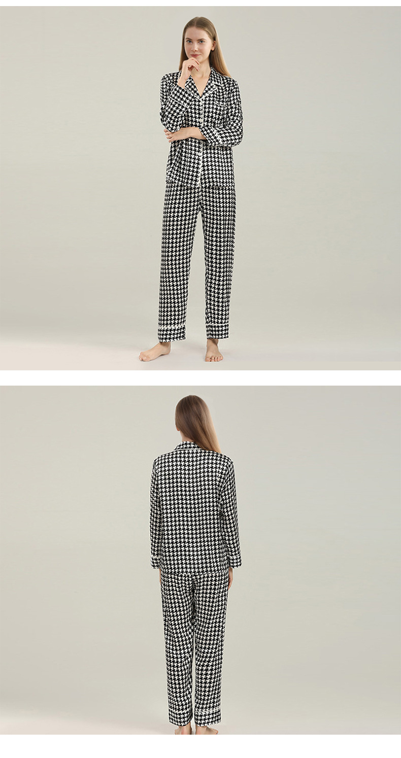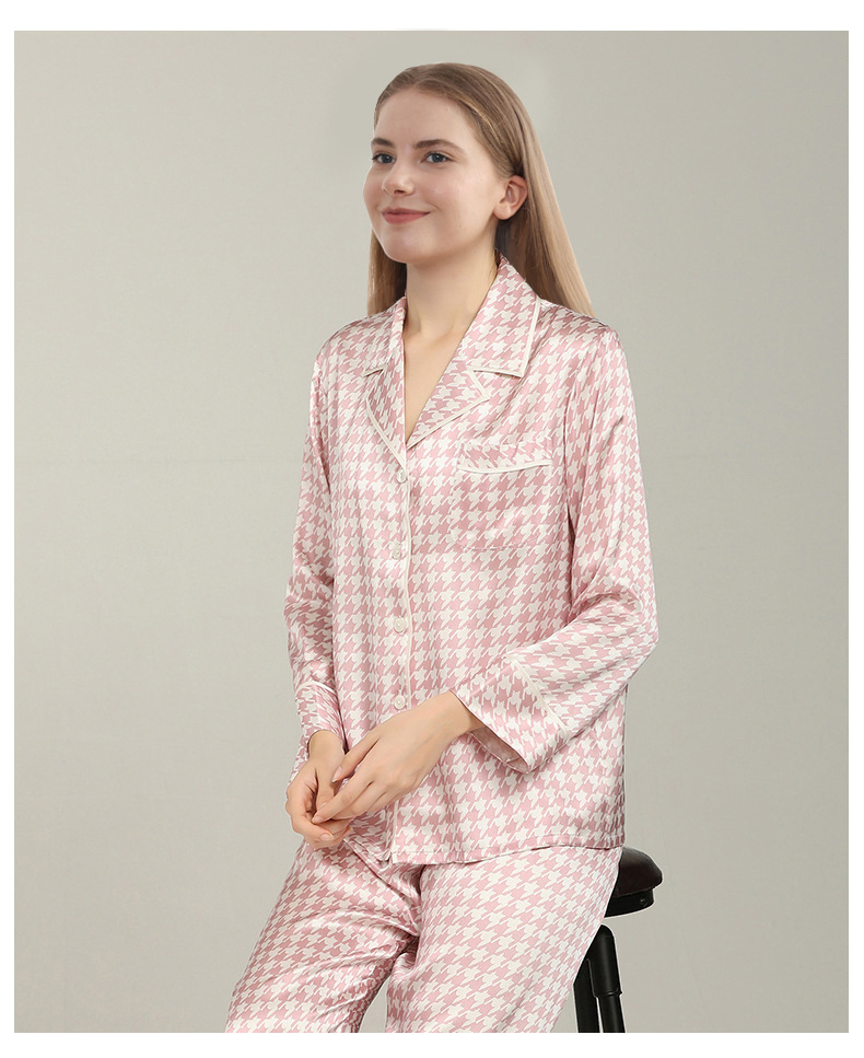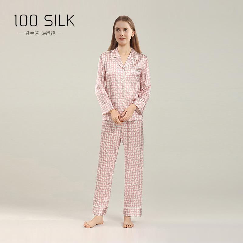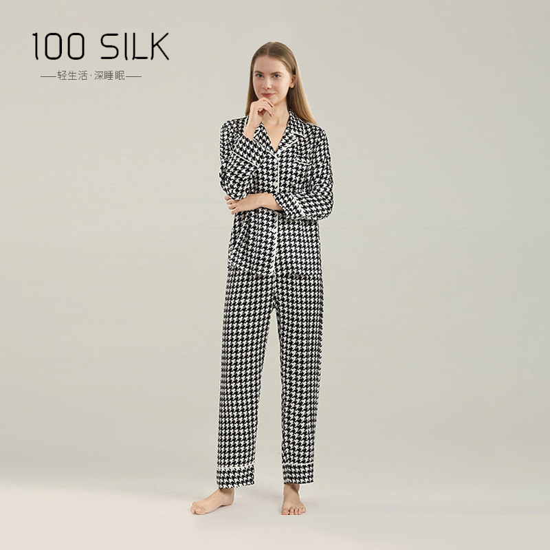 19mm 하운드투스 무늬 고급 실크 잠옷 100% 뽕나무 실크 여성 홈웨어 긴팔 긴바지 세트 도매스토어 가기