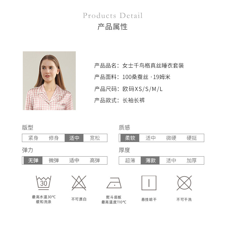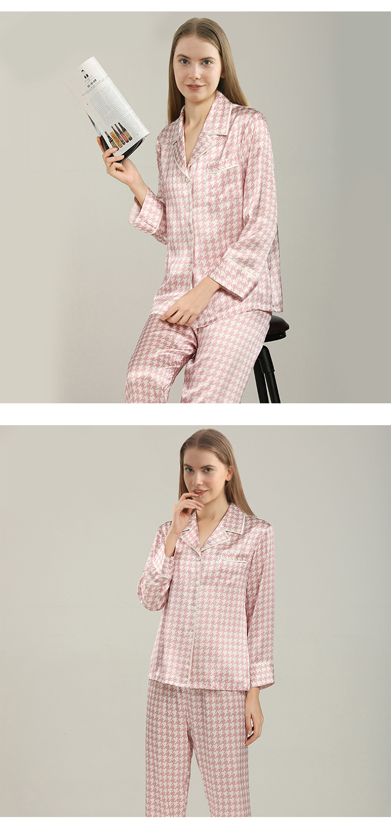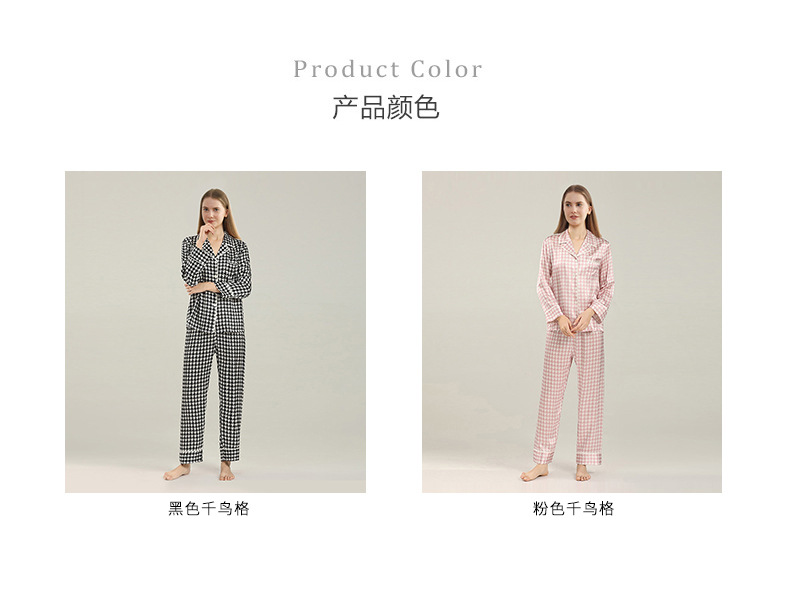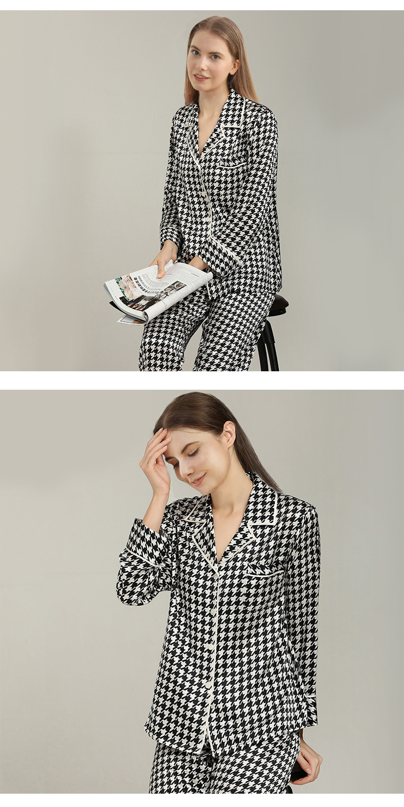 19mm 하운드투스 무늬 고급 실크 잠옷 100% 뽕나무 실크 여성 홈웨어 긴팔 긴바지 세트 도매스토어 가기