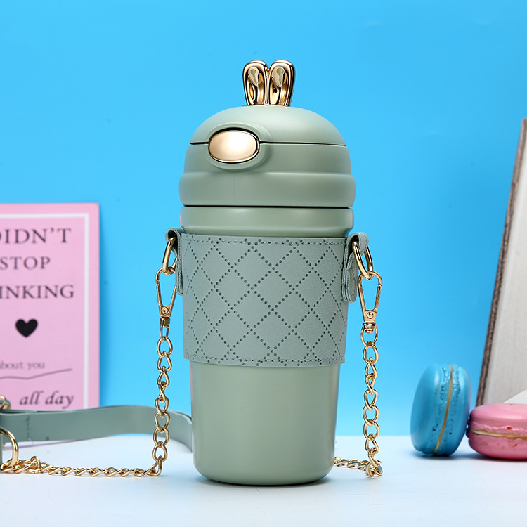 패션 귀여운 토끼 바운스 밀짚 컵 304 스테인레스 스틸 진공 컵 여성의 휴대용 크로스 바디 토끼 이어 컵 워터 컵 도매