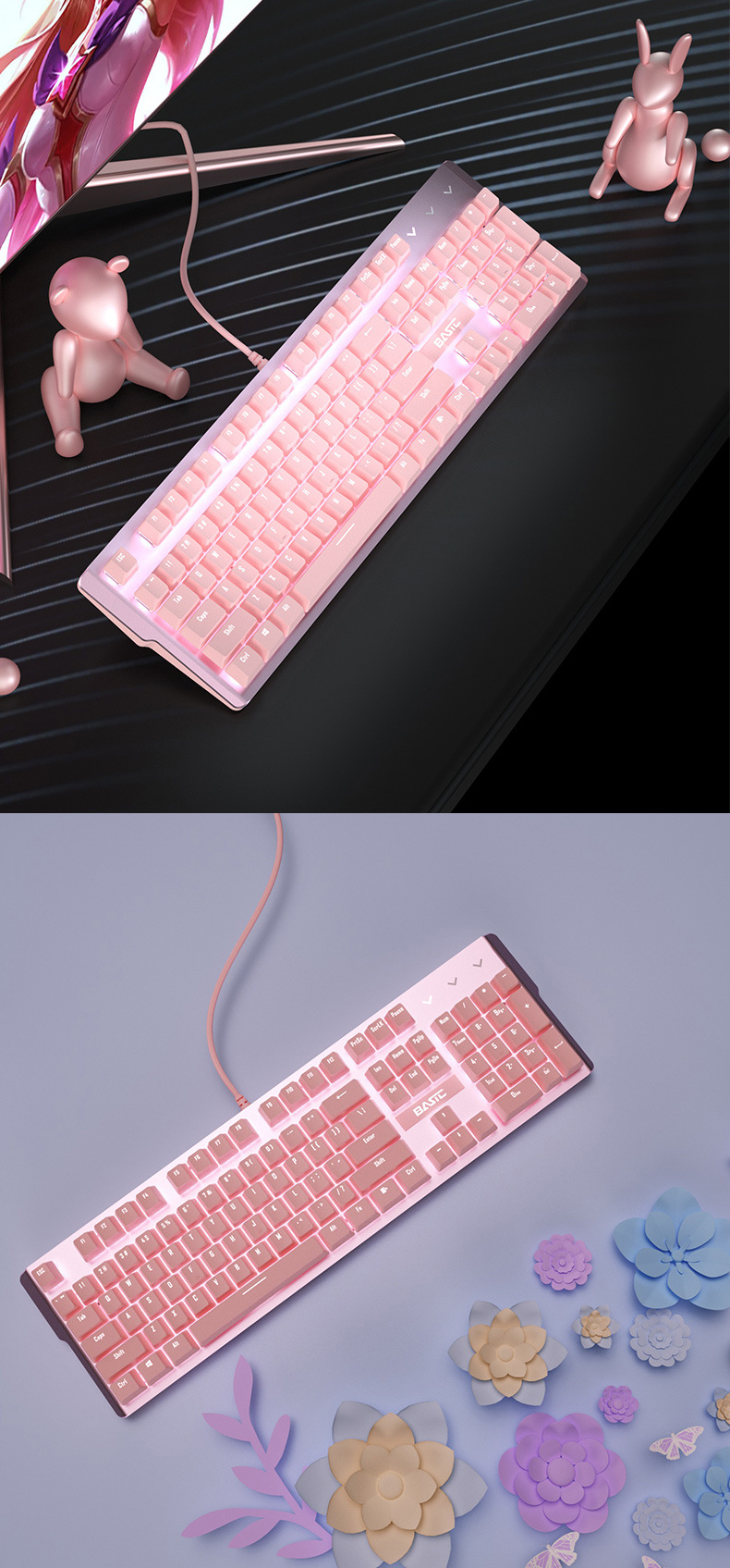 • 분홍색과 흰색 기계식 키보드(빨간색 축) + 분홍색 마우스 + 분홍색 헤드폰