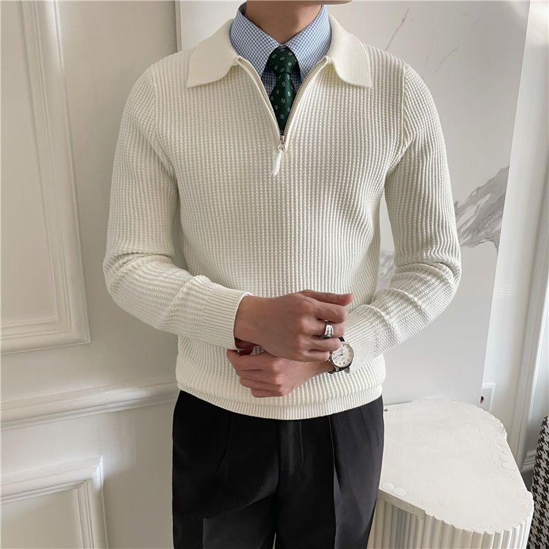 영국 남성용 긴팔 하프 지퍼 폴로 라펠 스웨터 풀오버 와플 원단 슬림핏 단색 울 탑