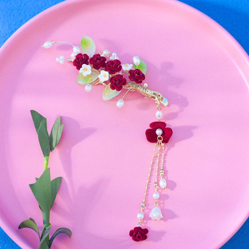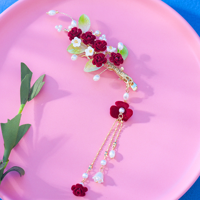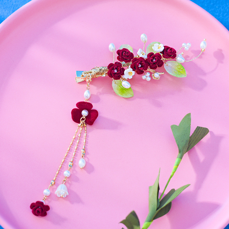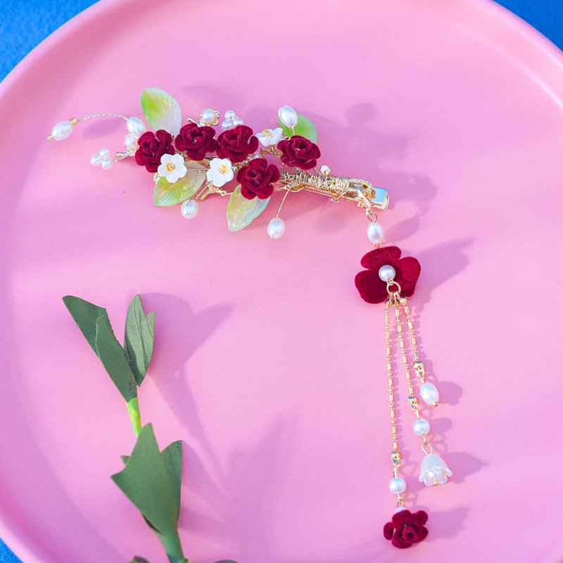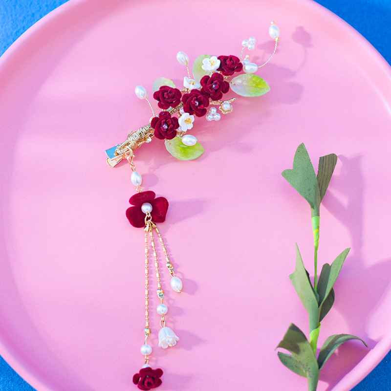 새로운 빨간 벨벳 꽃 머리핀 여성의 새해 축제 성격 절묘한 가장자리 클립 가을과 겨울 멋진 헤어 액세서리스토어 가기