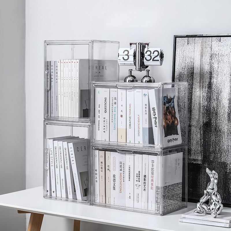 책 보관함 학생 책 보관함 겹치는 수직 및 수직 방진 투명 책 상자 정렬 바구니 랙스토어 가기