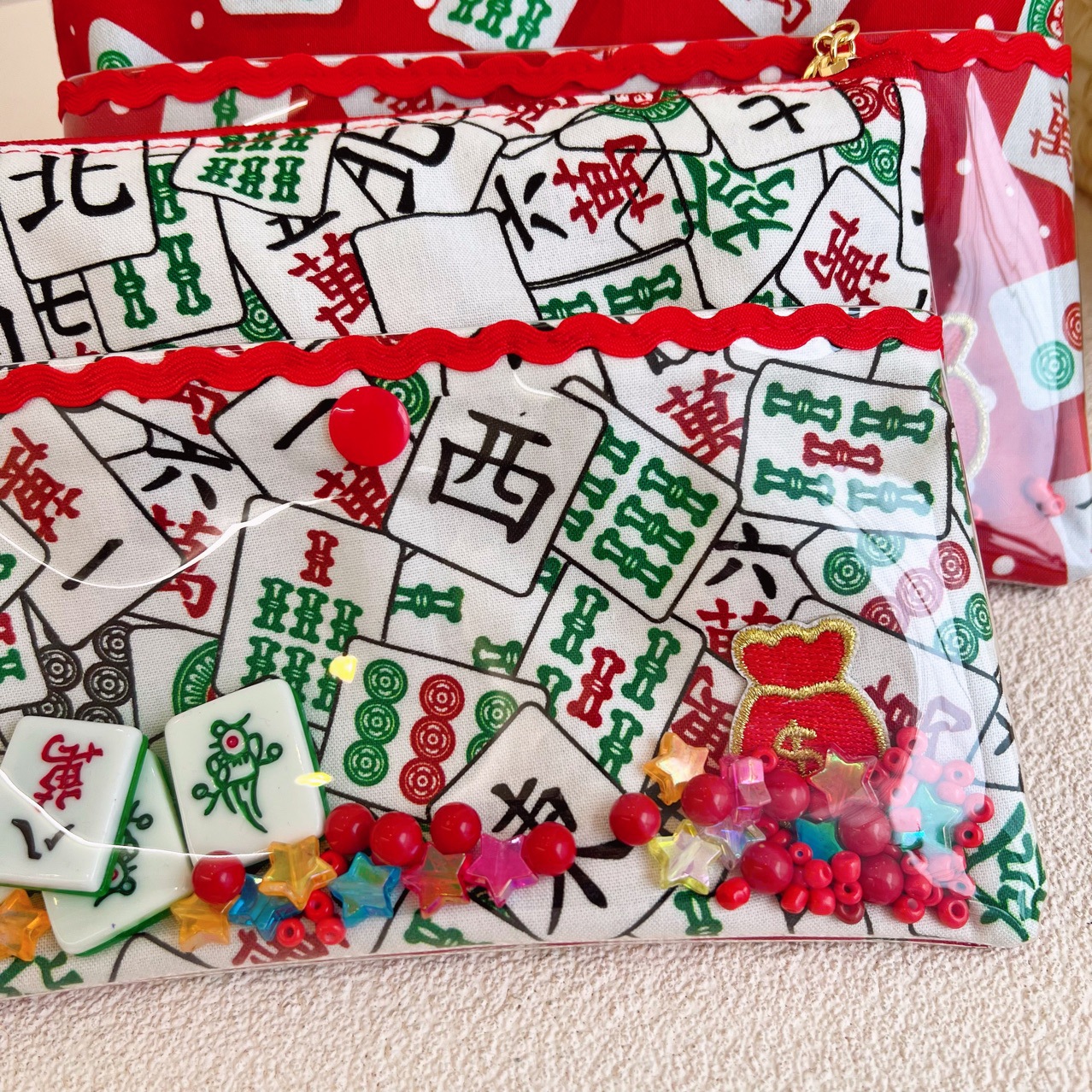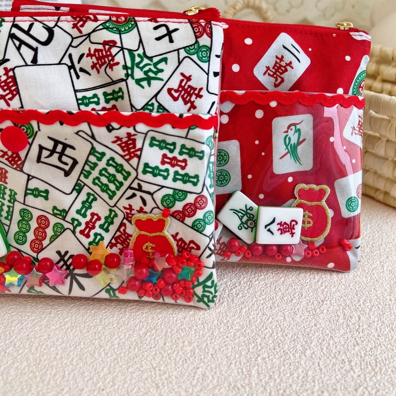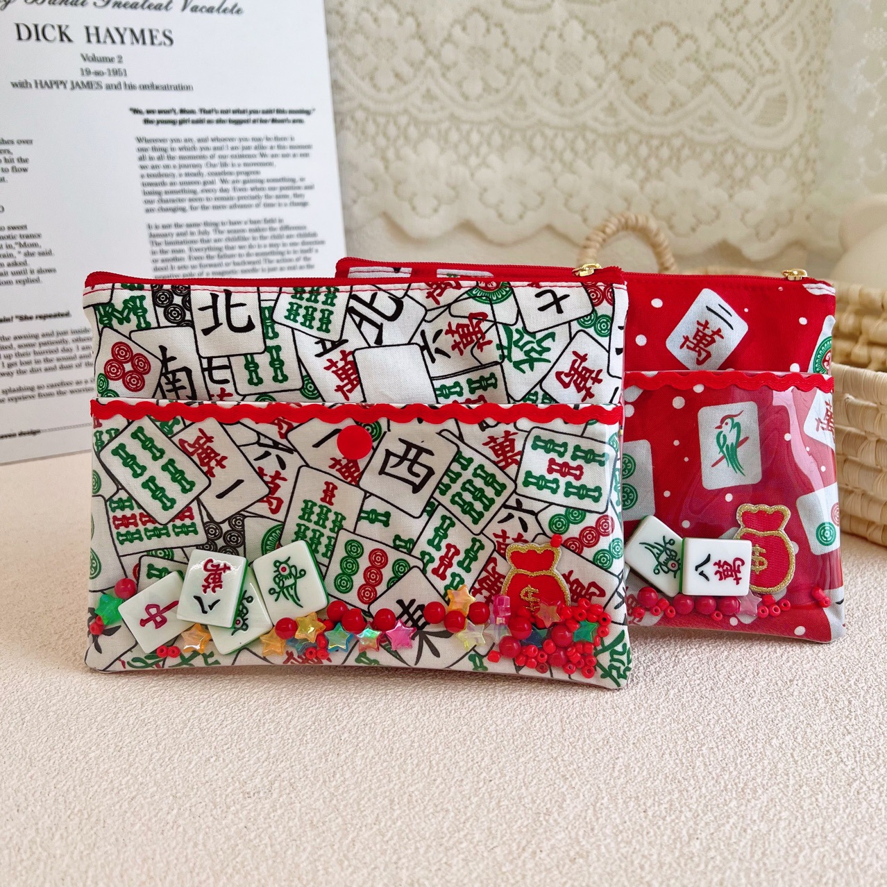 麻将印花棉布双层透明TPU流沙化妆包手机零钱包便携手包工厂批发