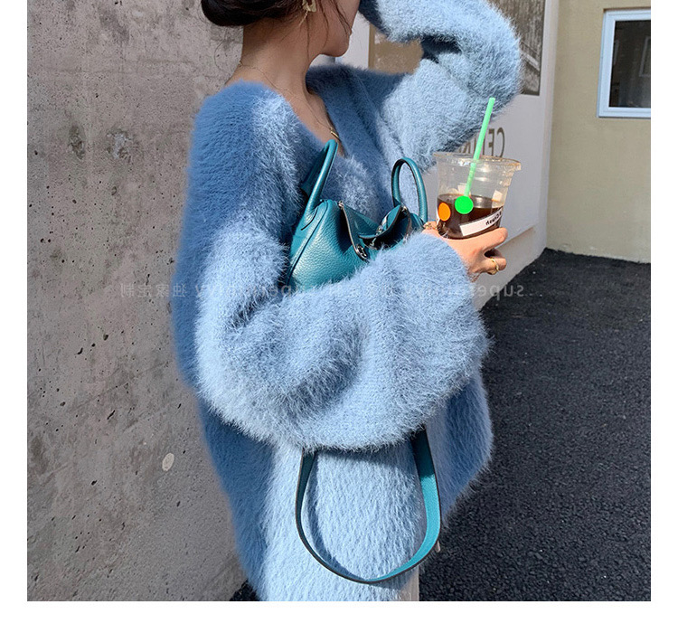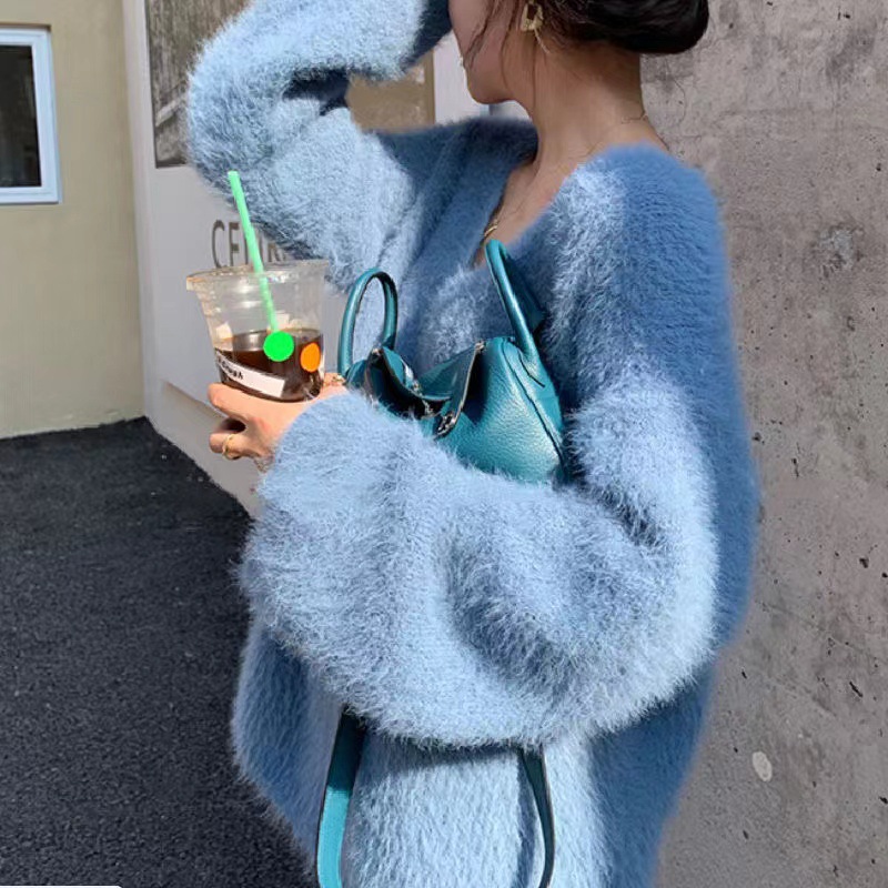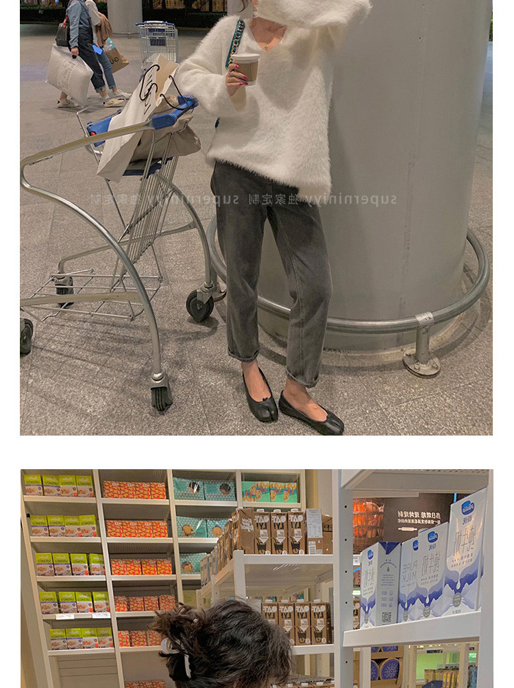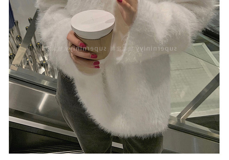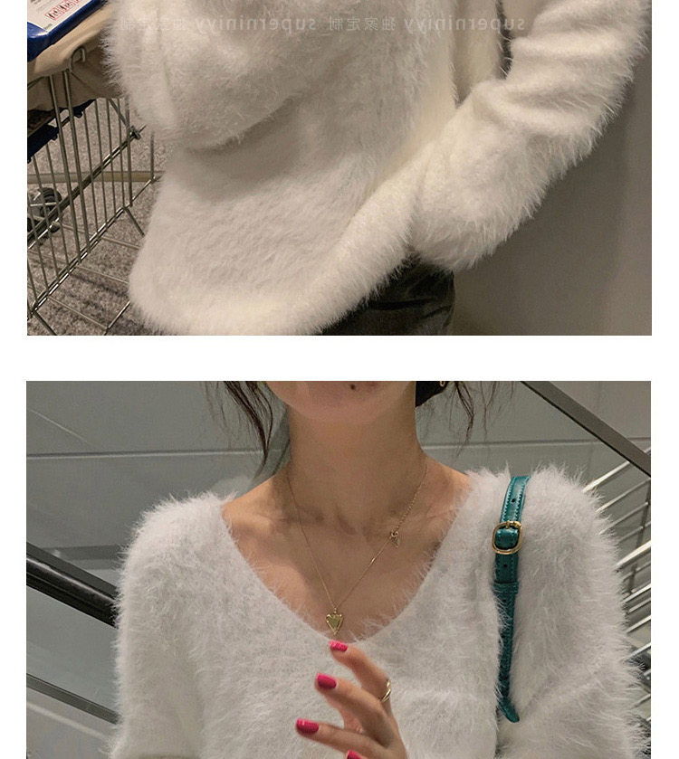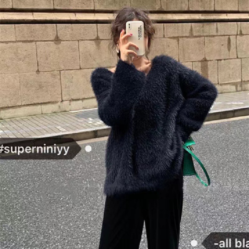 2024 가을 겨울 신상 한국 스타일 화이트 브이넥 해마털 스웨터 여성용 루즈핏 인조 밍크 니트 베이스 셔츠스토어 가기
