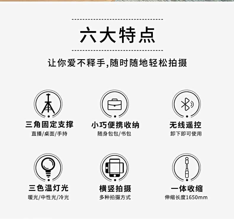• 1.7m 흰색 듀얼 필 라이트 + Douyin Kuaishou 원격 제어 BT12를 촬영할 수 있습니다.