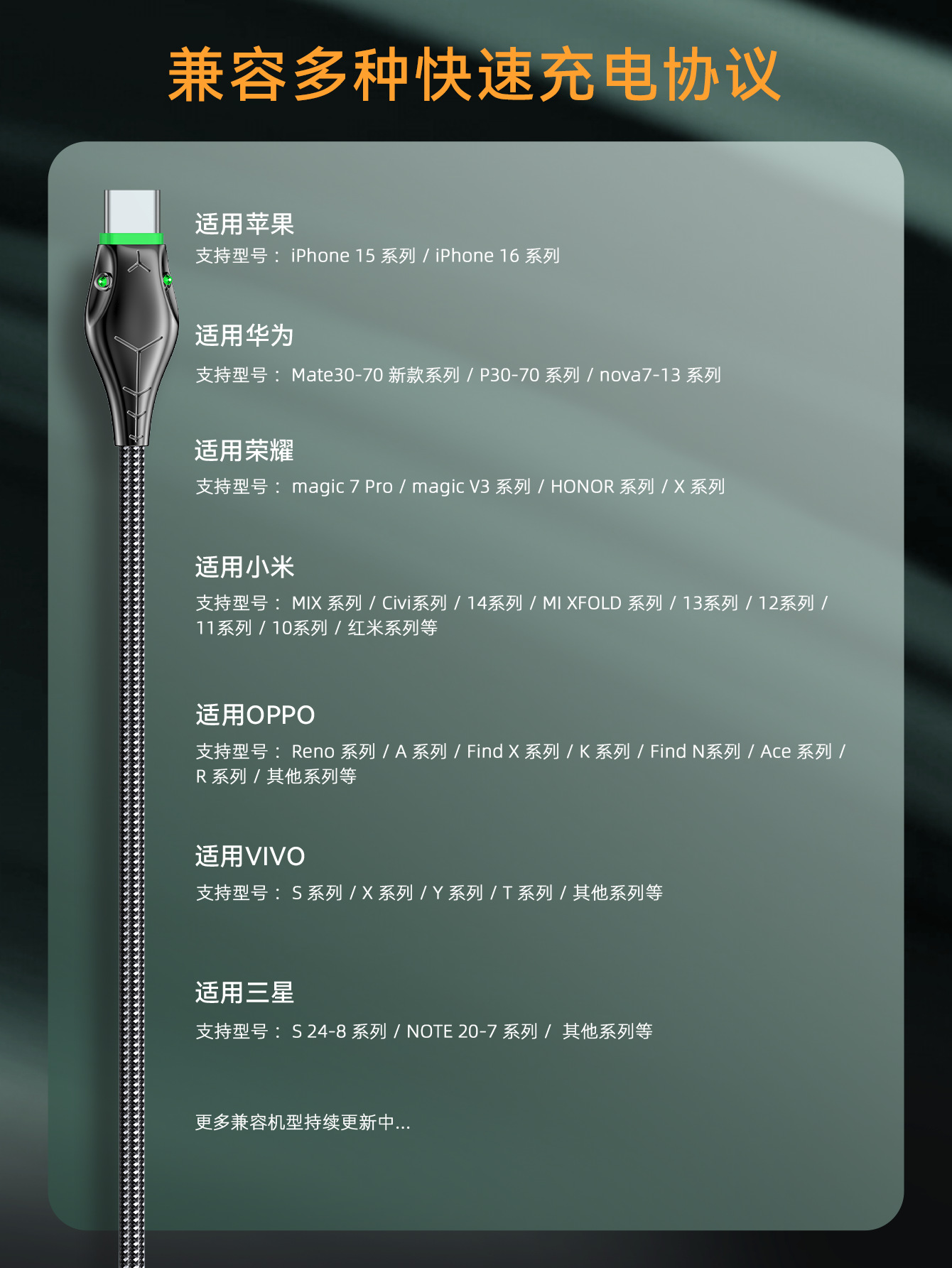 【兼容清单】支持华为100W超级快充;支持OPPO Super VOOC 100W 80W 65W快充协议;支持小米27W快充;三星AFC快速充电; 支持苹果15/16系列充电;支持其他手机QC3.0快充。