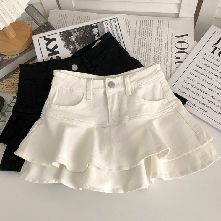 여아 더블 레이어 러플 탄성 데님 스커트 여름 새로운 한국식 탄성 허리 눈부심 방지 A 라인 스커트스토어 가기