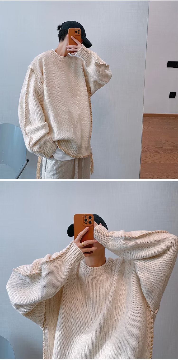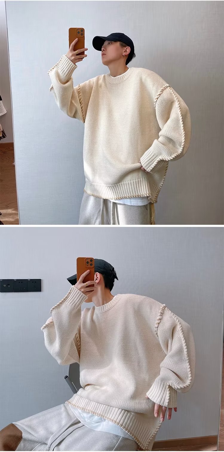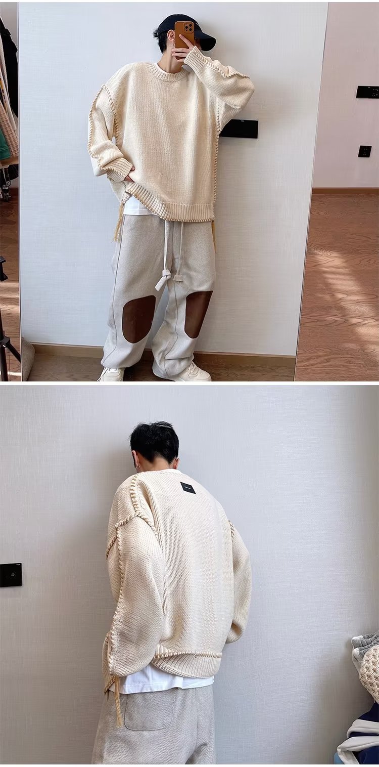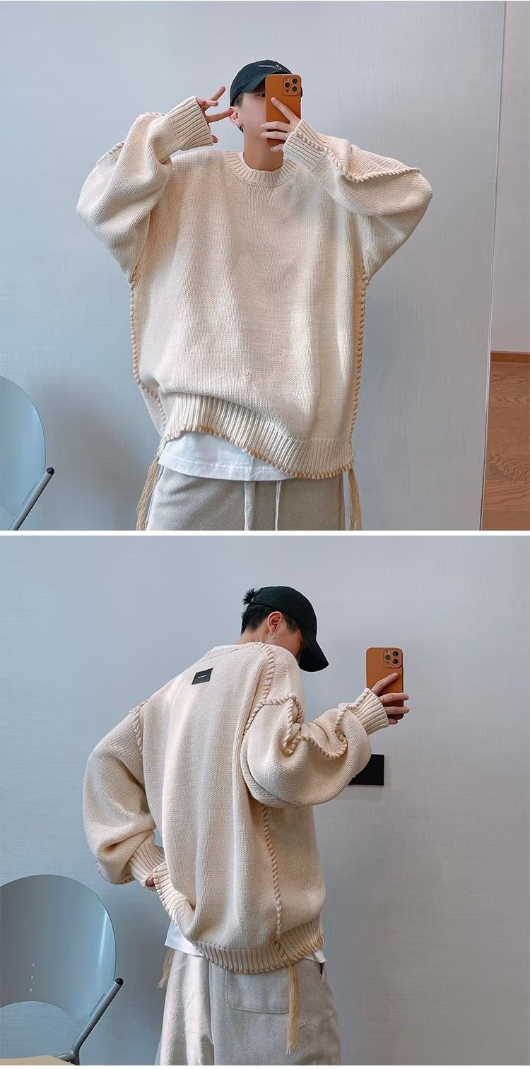가을과 겨울 새로운 패션 브랜드 복고풍 느슨한 다크 브라운 니트 스웨터 소년을위한 무거운 손 실 스웨터스토어 가기