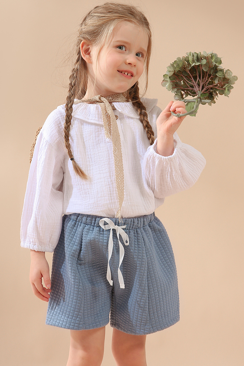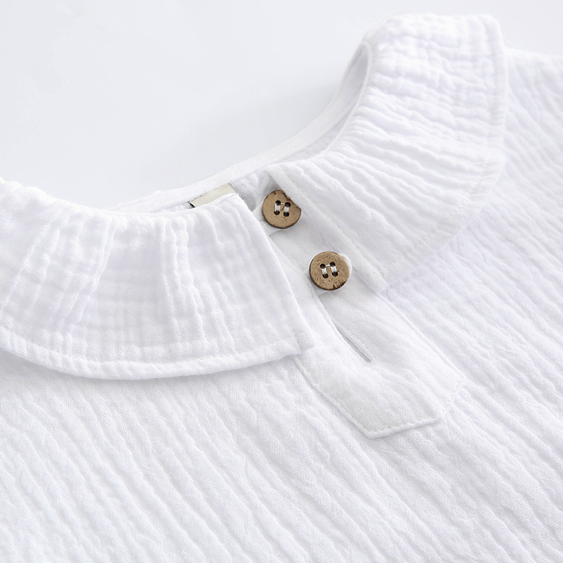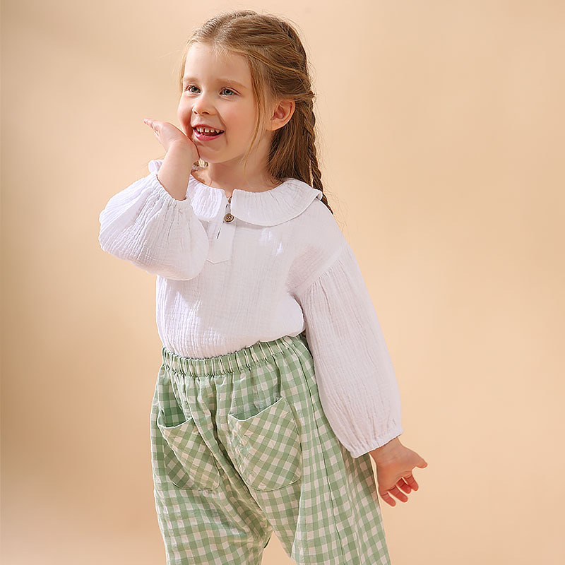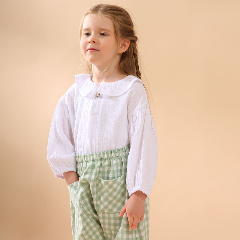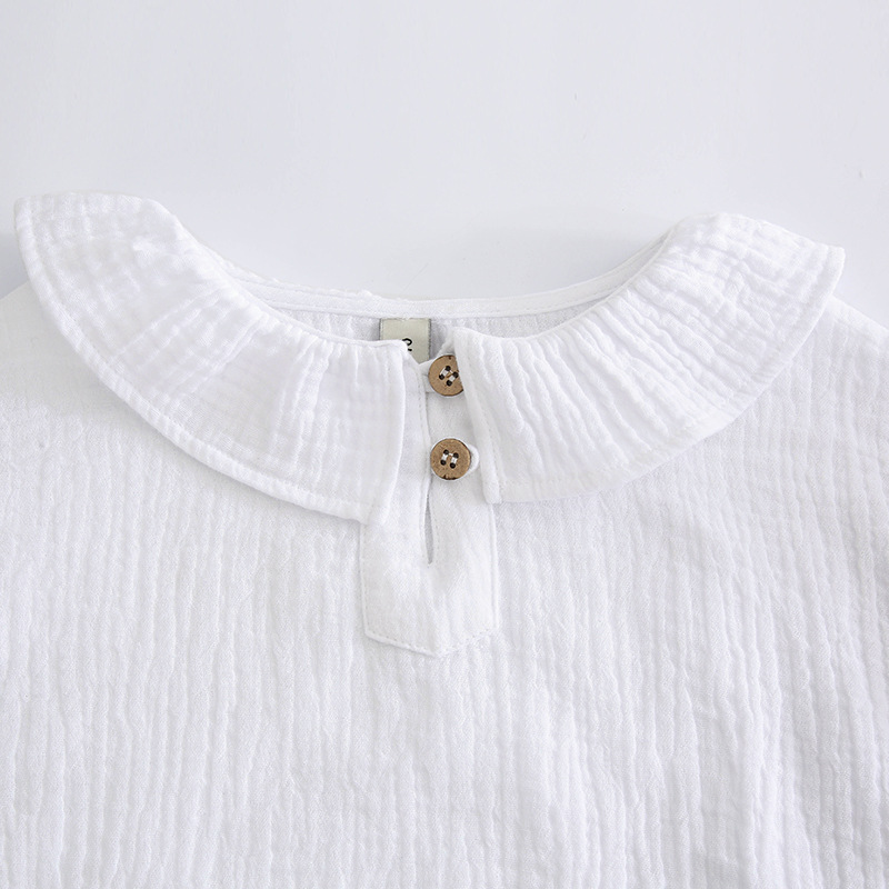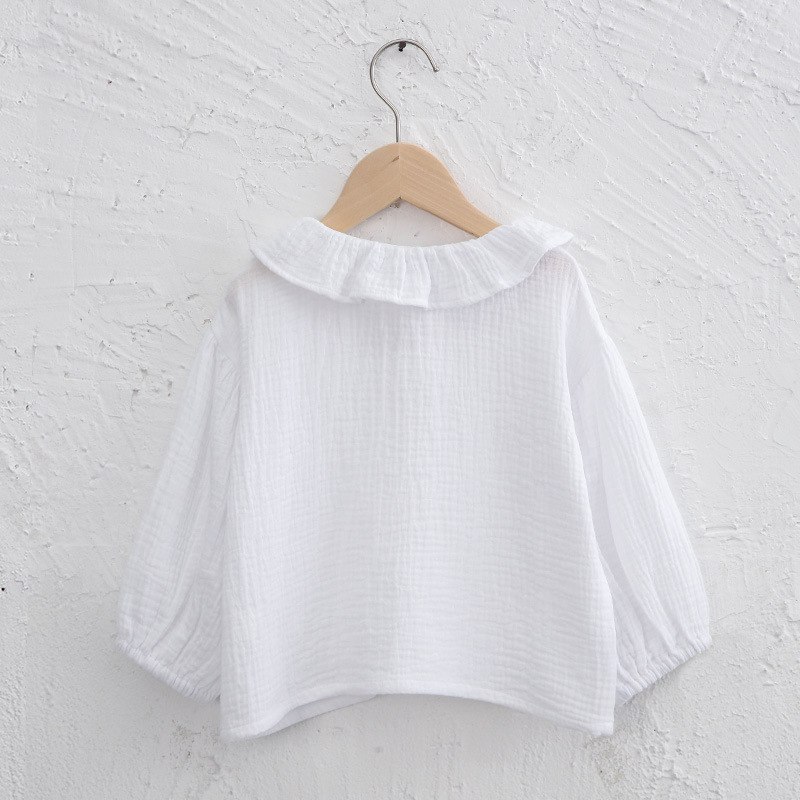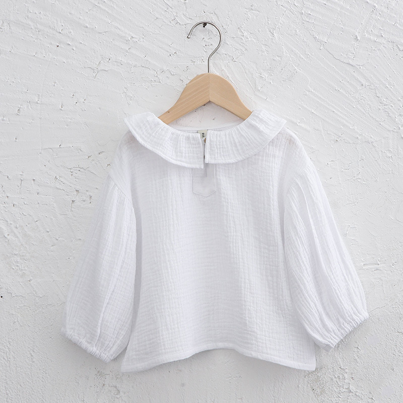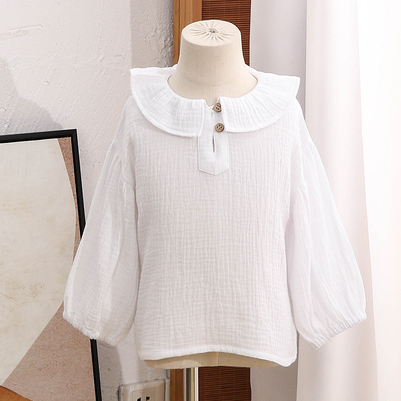여자 더블 레이어 코튼 거즈 셔츠 연꽃 잎 칼라 피부 친화적 인 2025 봄 새로운 귀여운 스타일 랜턴 슬리브 아동 의류 순수 코튼 탑