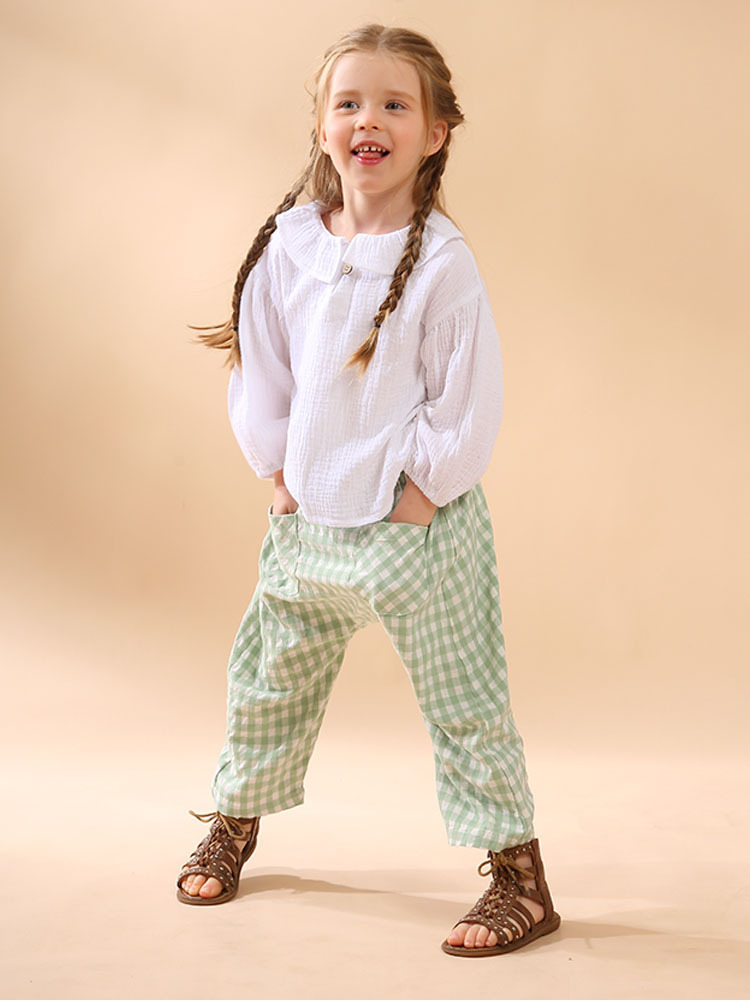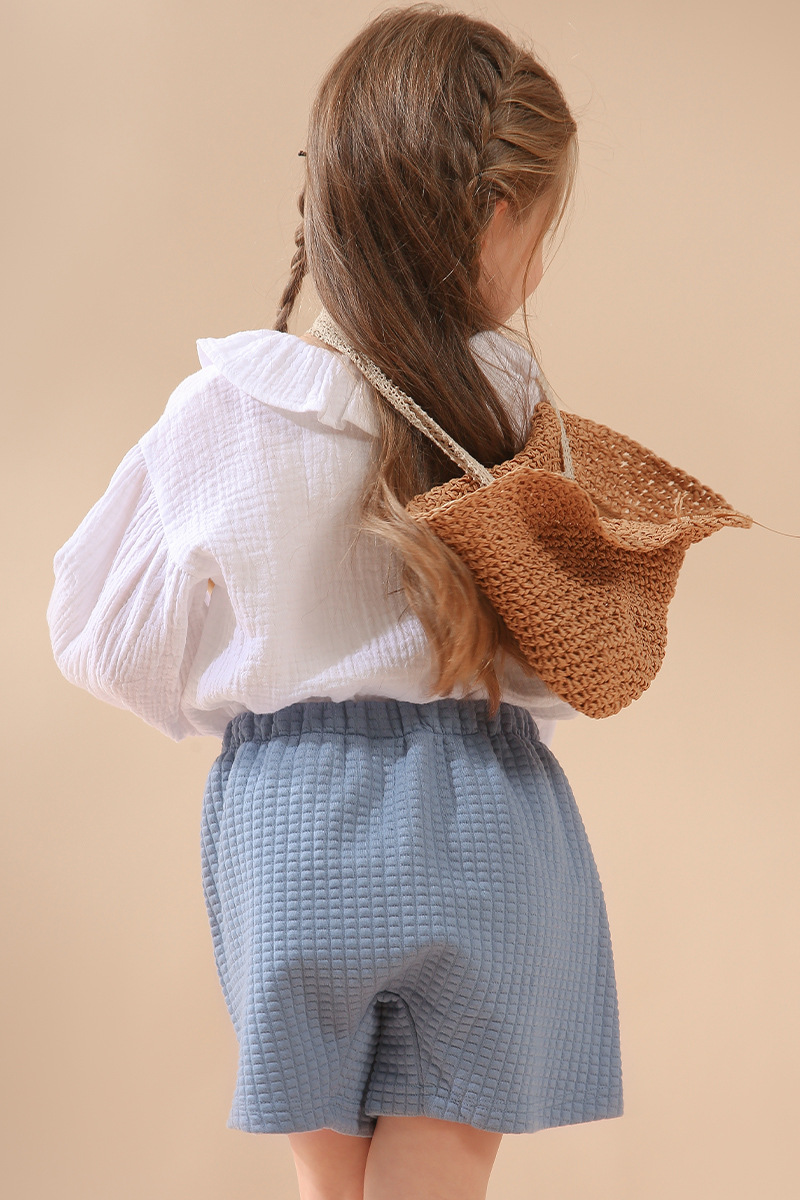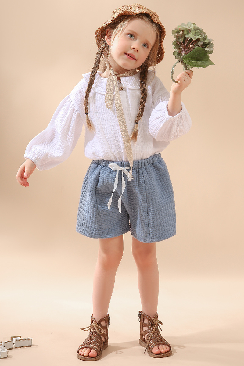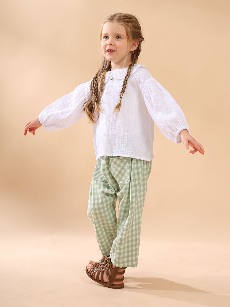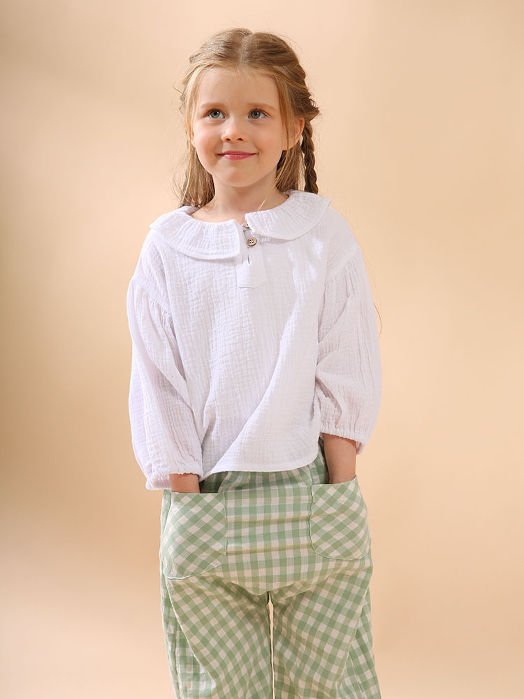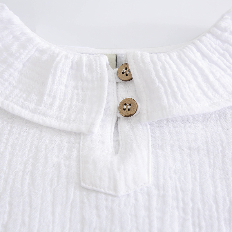 여자 더블 레이어 코튼 거즈 셔츠 연꽃 잎 칼라 피부 친화적 인 2025 봄 새로운 귀여운 스타일 랜턴 슬리브 아동 의류 순수 코튼 탑