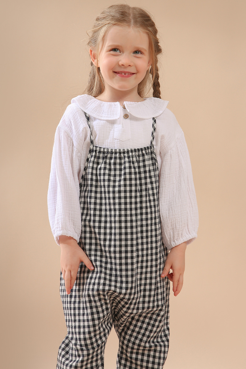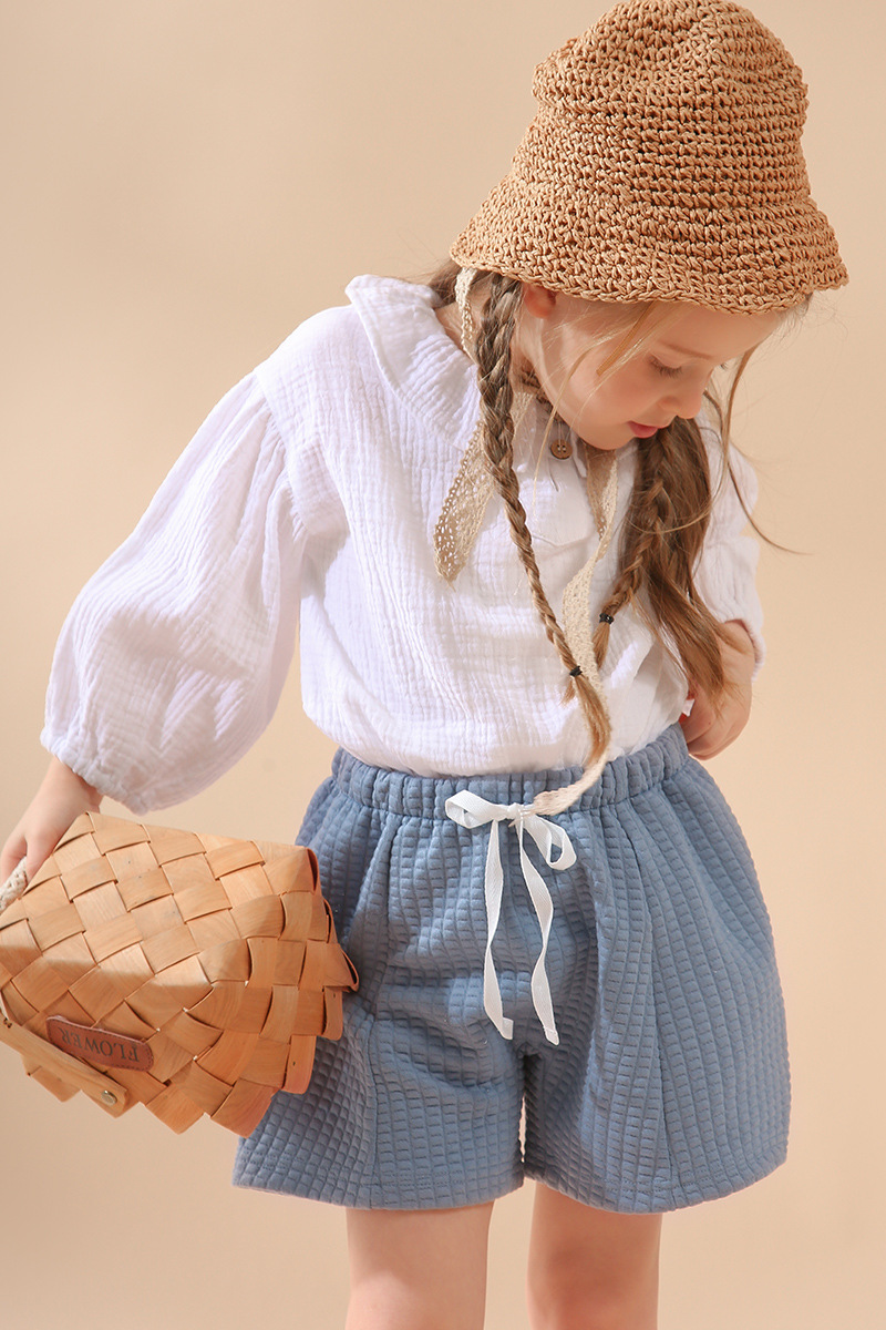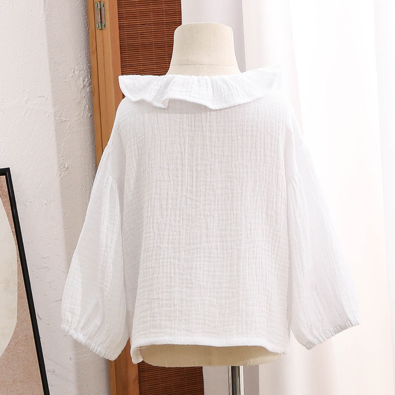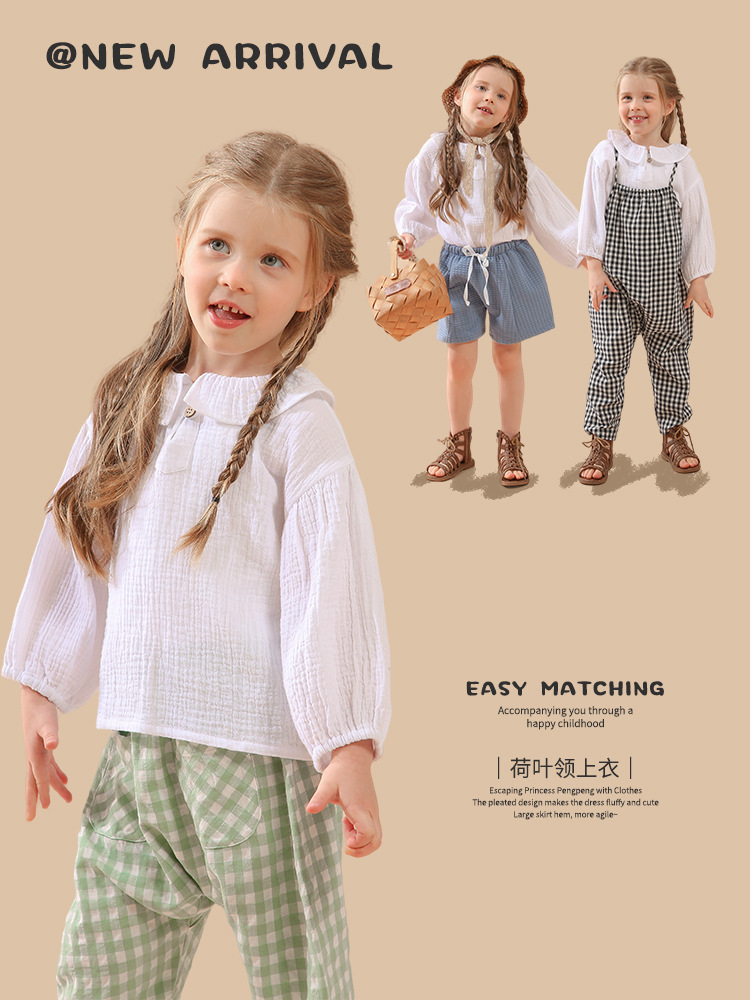 여자 더블 레이어 코튼 거즈 셔츠 연꽃 잎 칼라 피부 친화적 인 2025 봄 새로운 귀여운 스타일 랜턴 슬리브 아동 의류 순수 코튼 탑스토어 가기