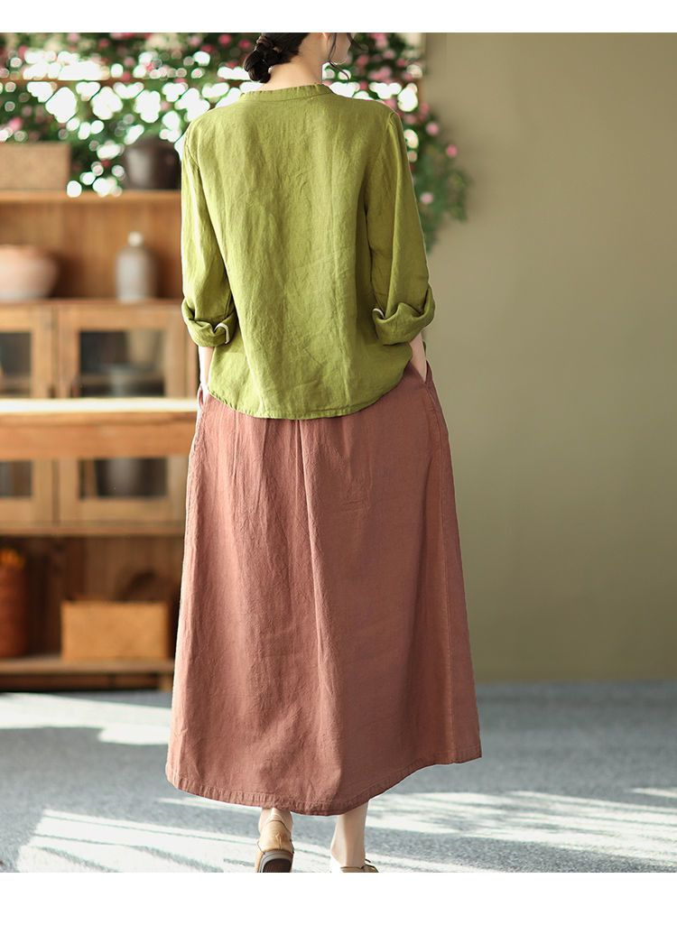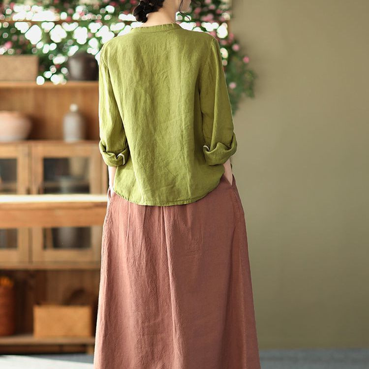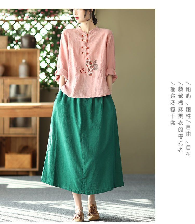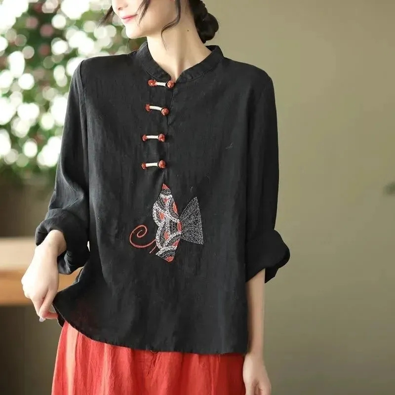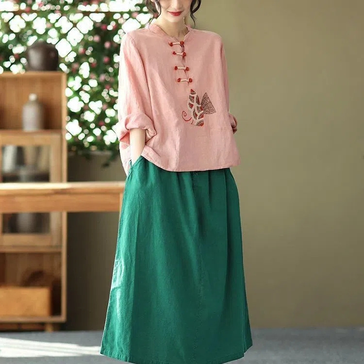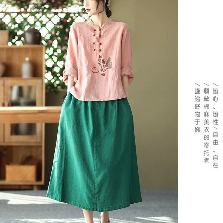 에스닉 스타일 플러스 사이즈 면과 린넨 셔츠 여자의 봄과 가을 긴 소매 버클 탑 예술적 자수 느슨한 탑 차 옷 여자스토어 가기