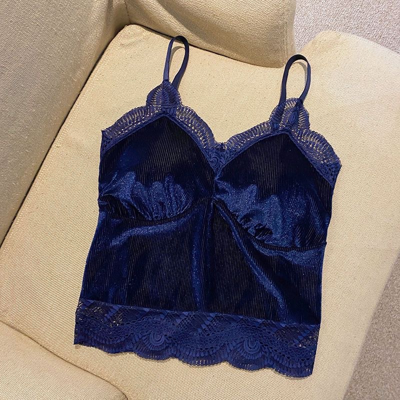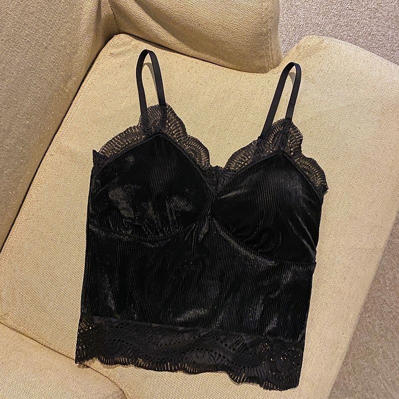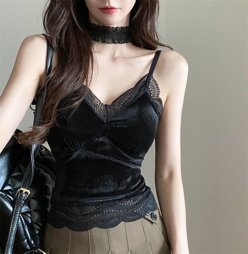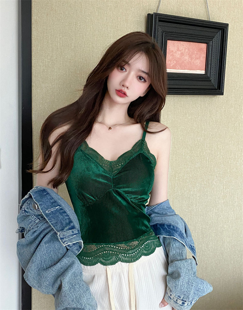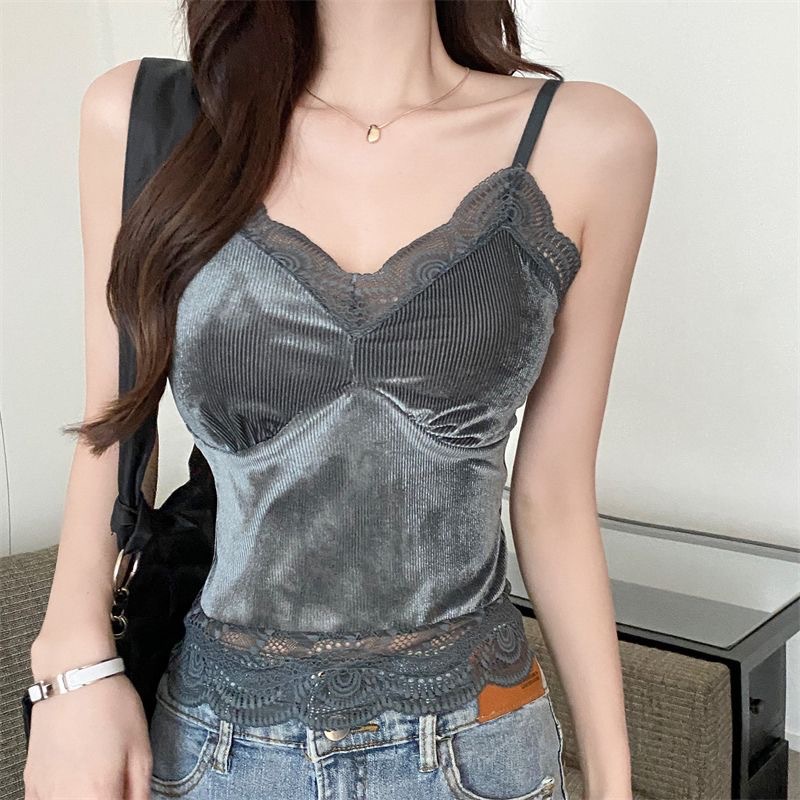 새로운 코듀로이 스티칭 레이스 섹시 슬림 핏 탑 아름다운 등 얇은 어깨 캐미솔 여성 연예인 우아한 인테리어스토어 가기