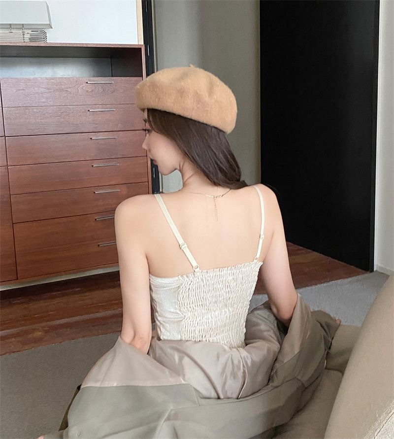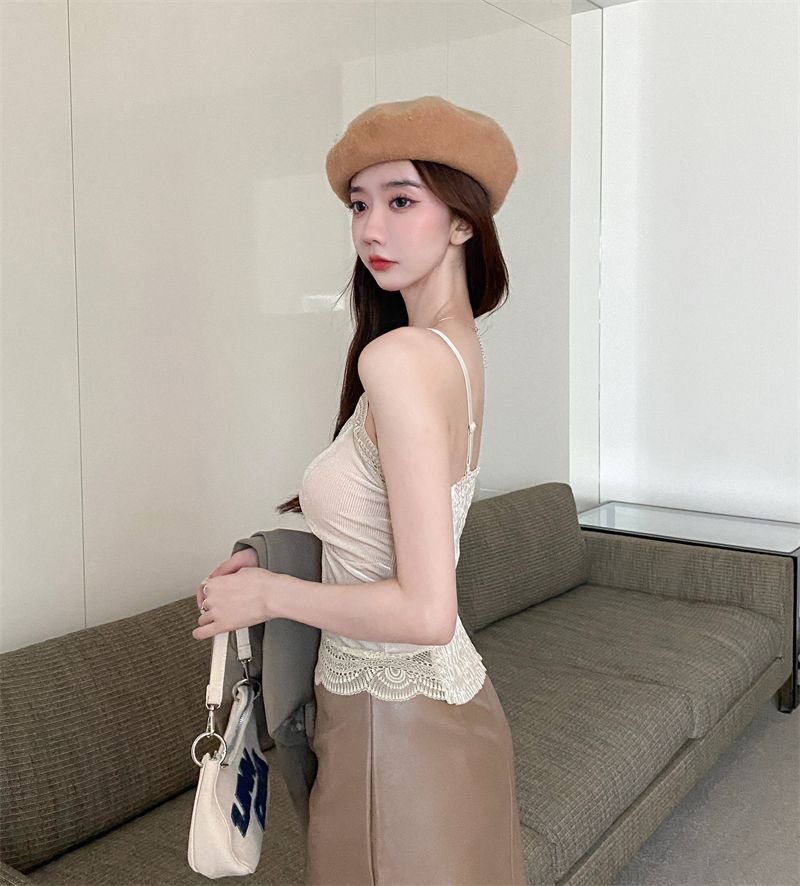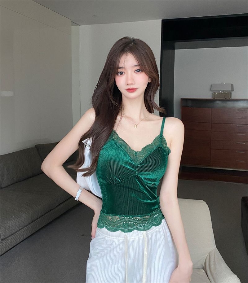 새로운 코듀로이 스티칭 레이스 섹시 슬림 핏 탑 아름다운 등 얇은 어깨 캐미솔 여성 연예인 우아한 인테리어