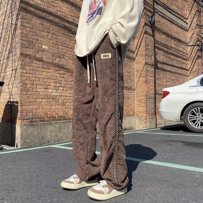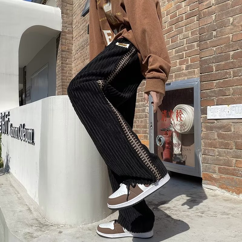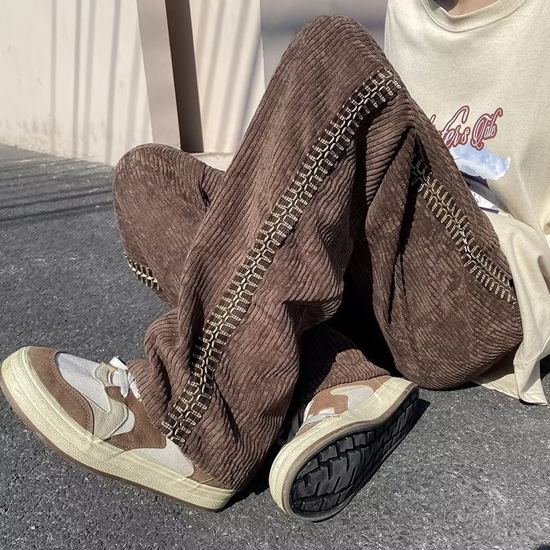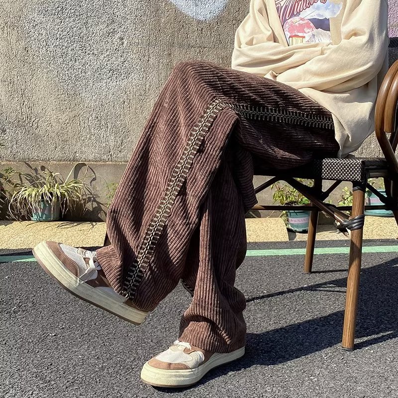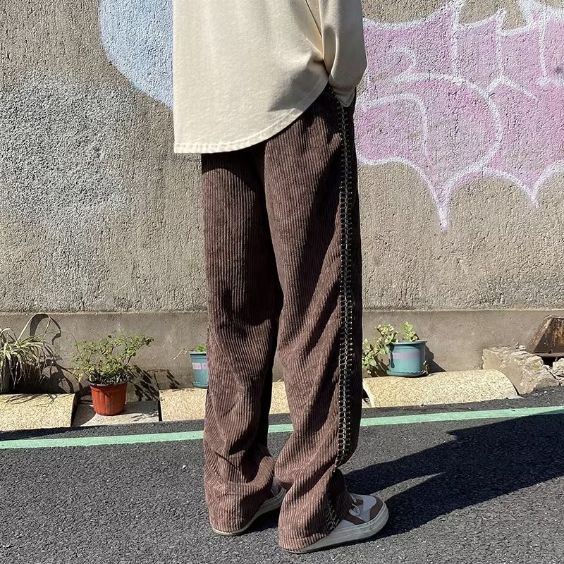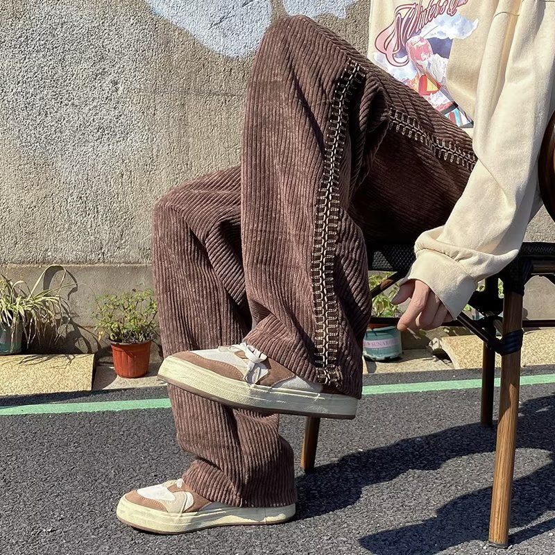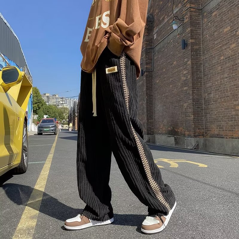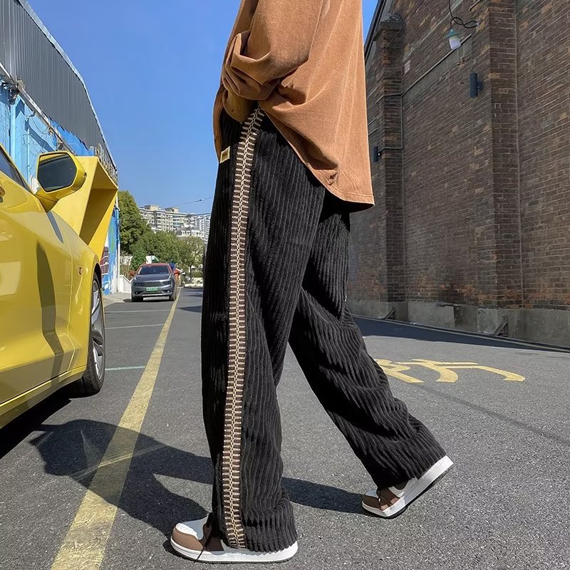 남성과 여성을위한 디자인 센스 틈새 코듀로이 캐주얼 바지 겨울 따뜻한 두꺼운 느슨한 스트레이트 다리 와이드 레그 바지 유행 헤어스토어 가기