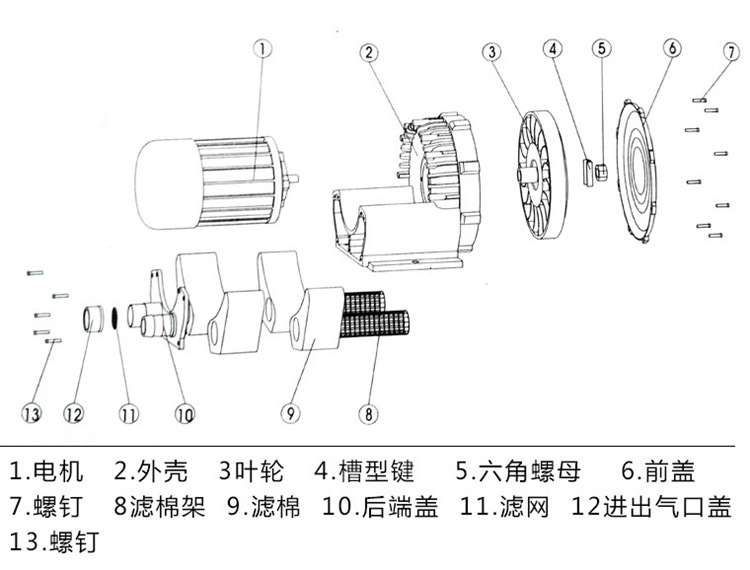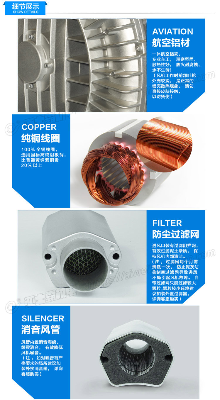 叶轮采用三维制式设计,配合截面分段变化的环形气流通道,