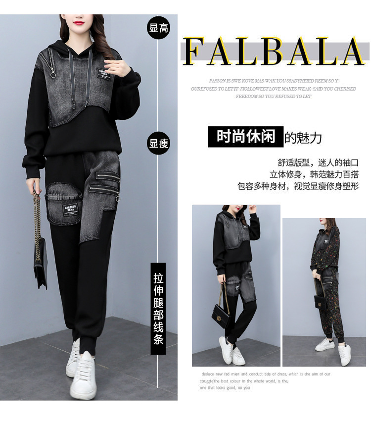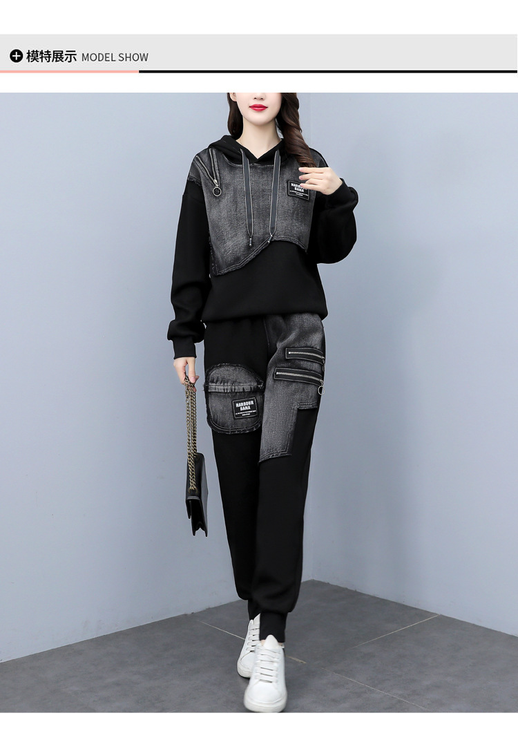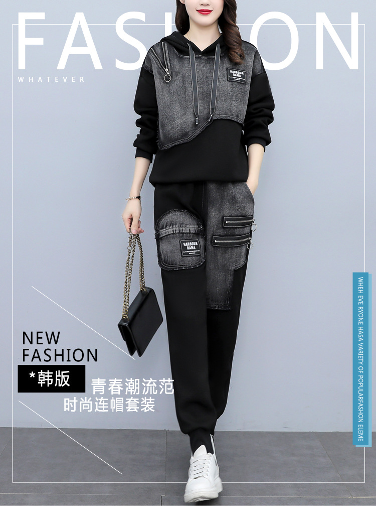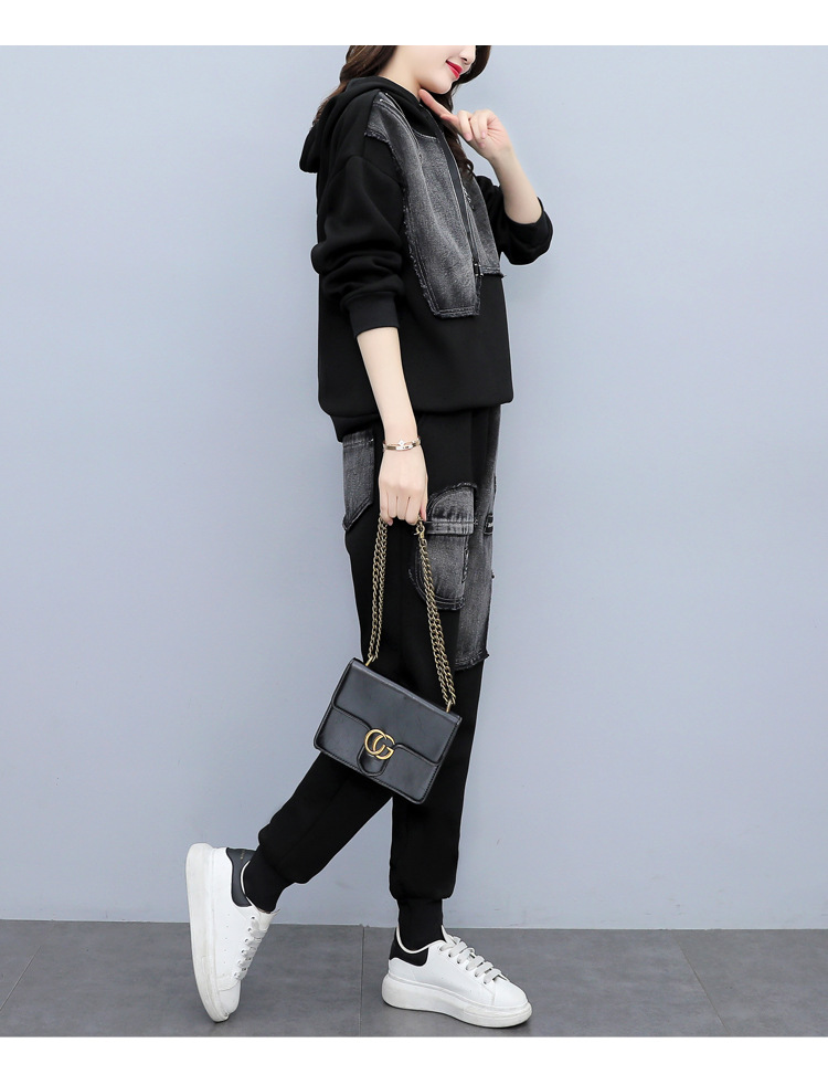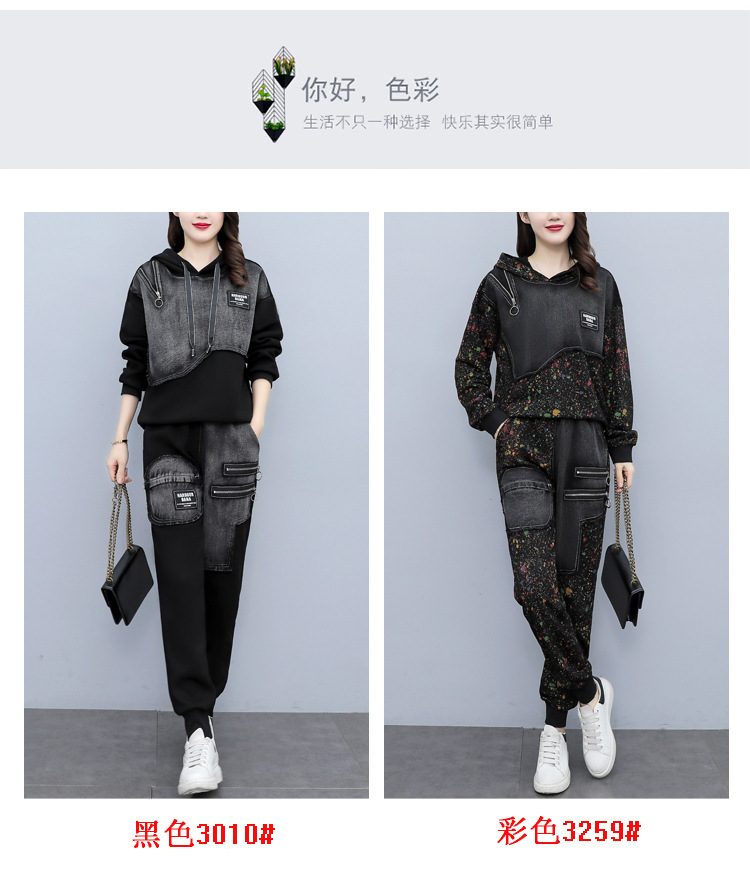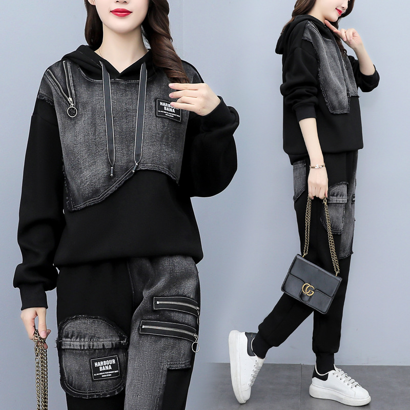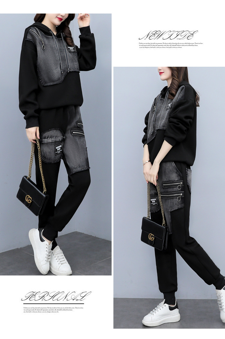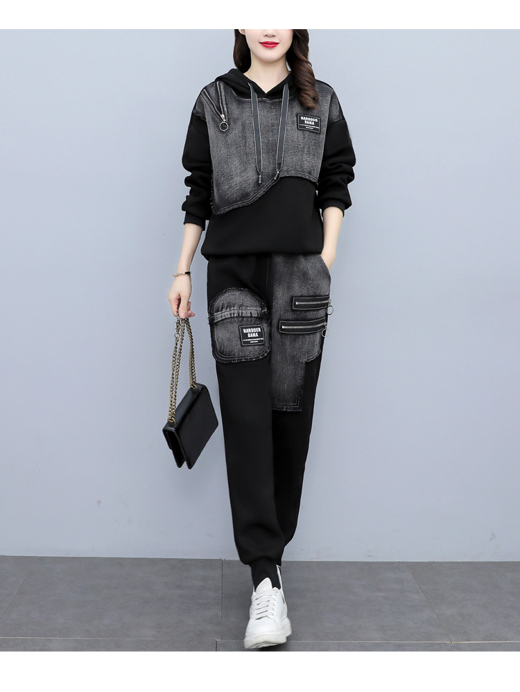 유럽 역 2023 봄과 가을 새로운 패션 세트 여성 스티치 데님 후드 스웨터 바지 투피스 패션 브랜드스토어 가기