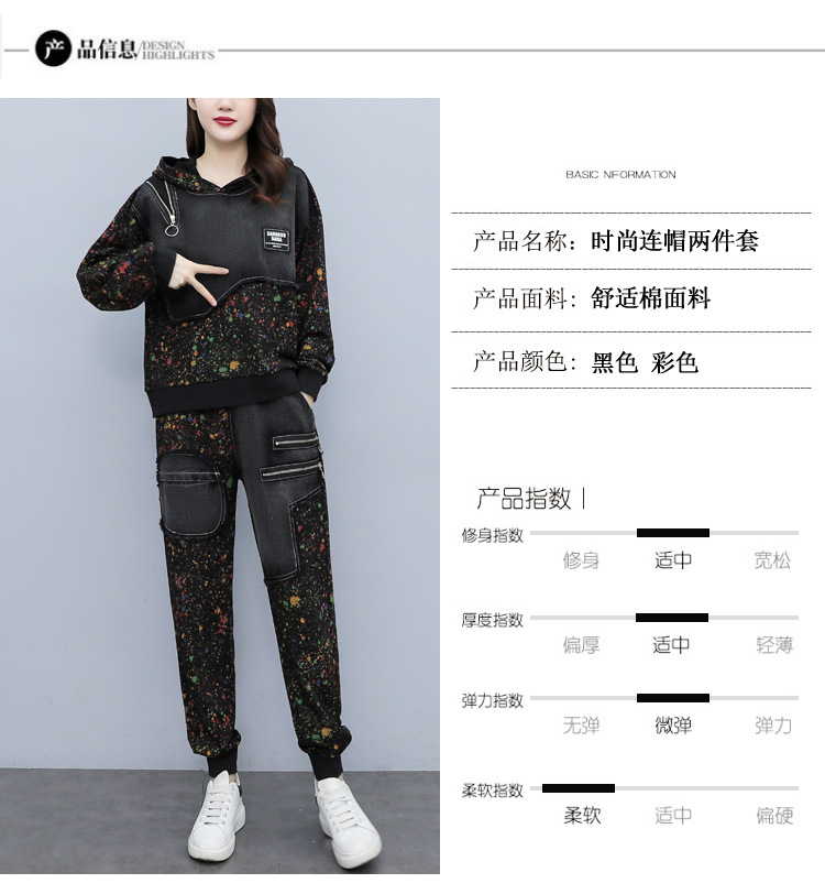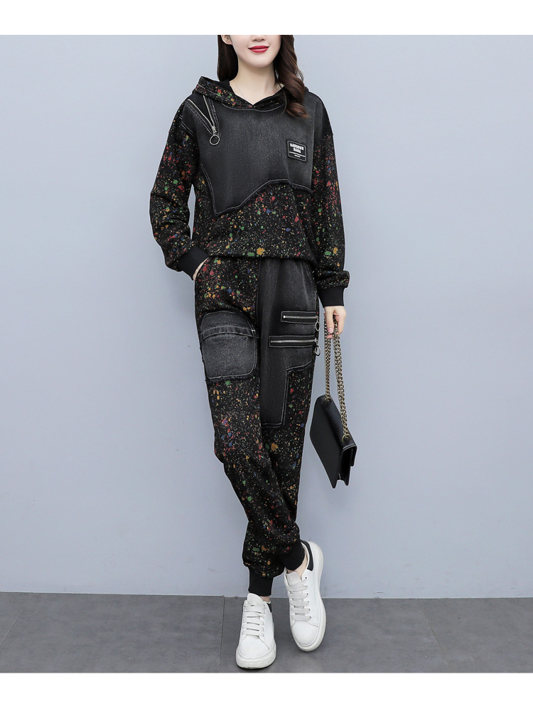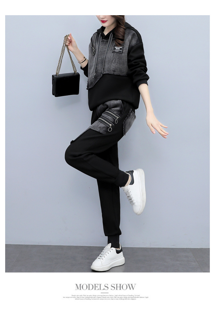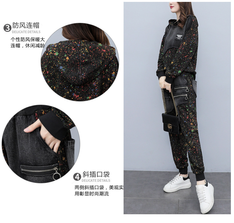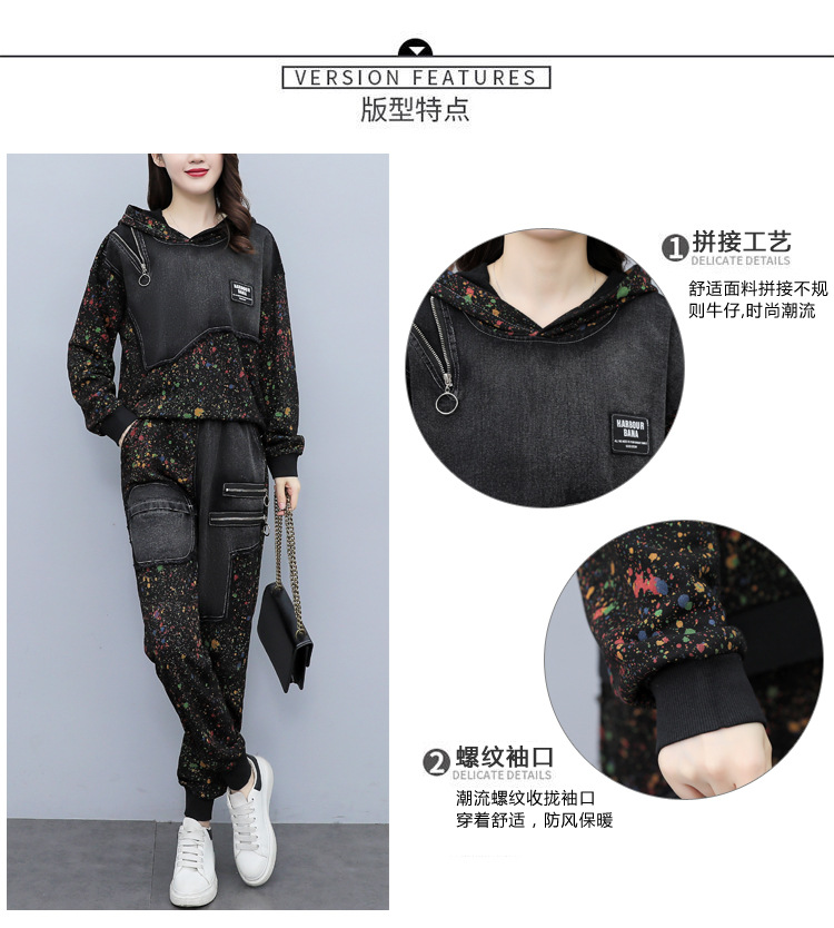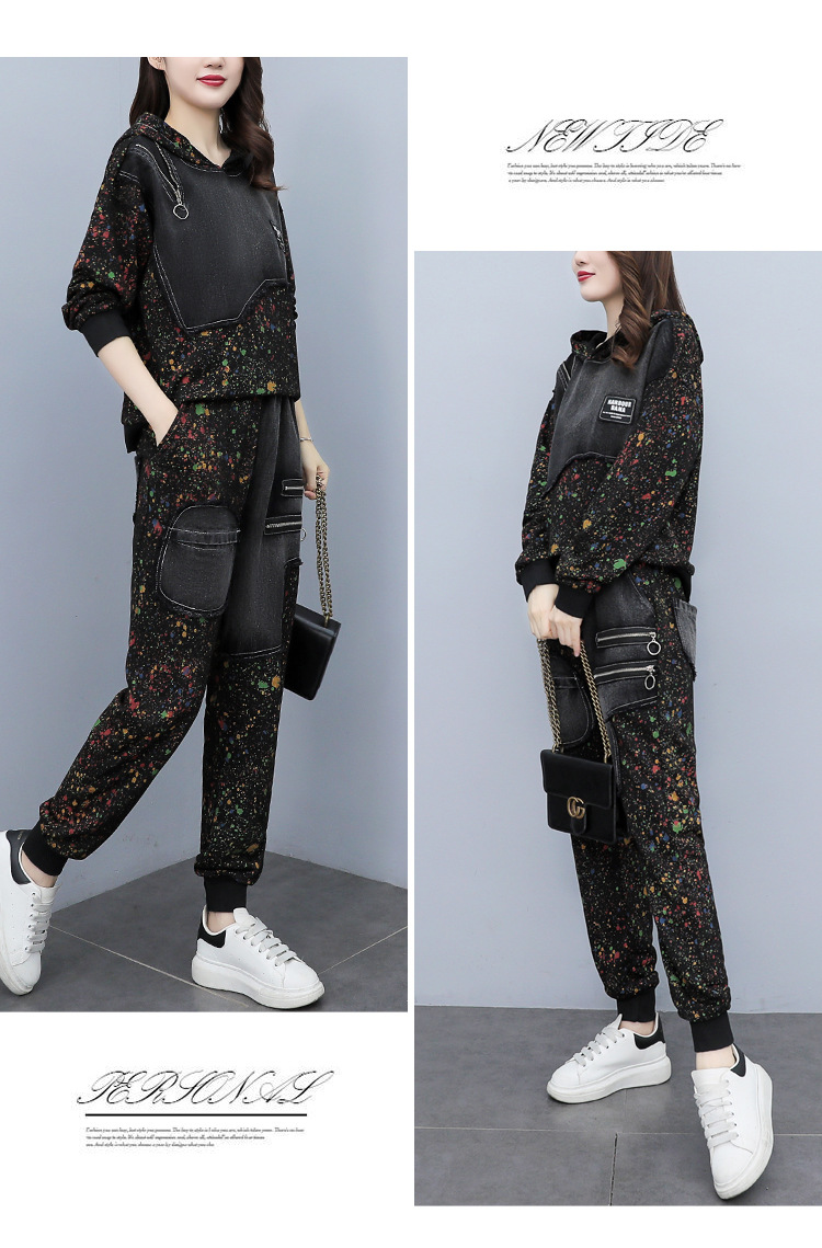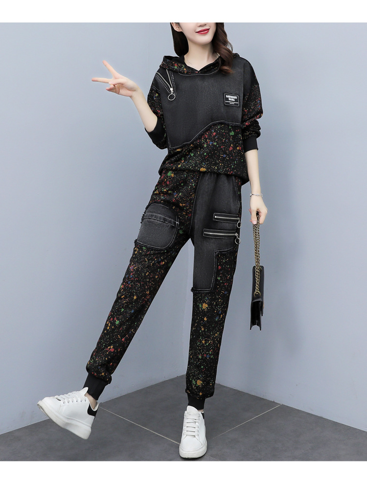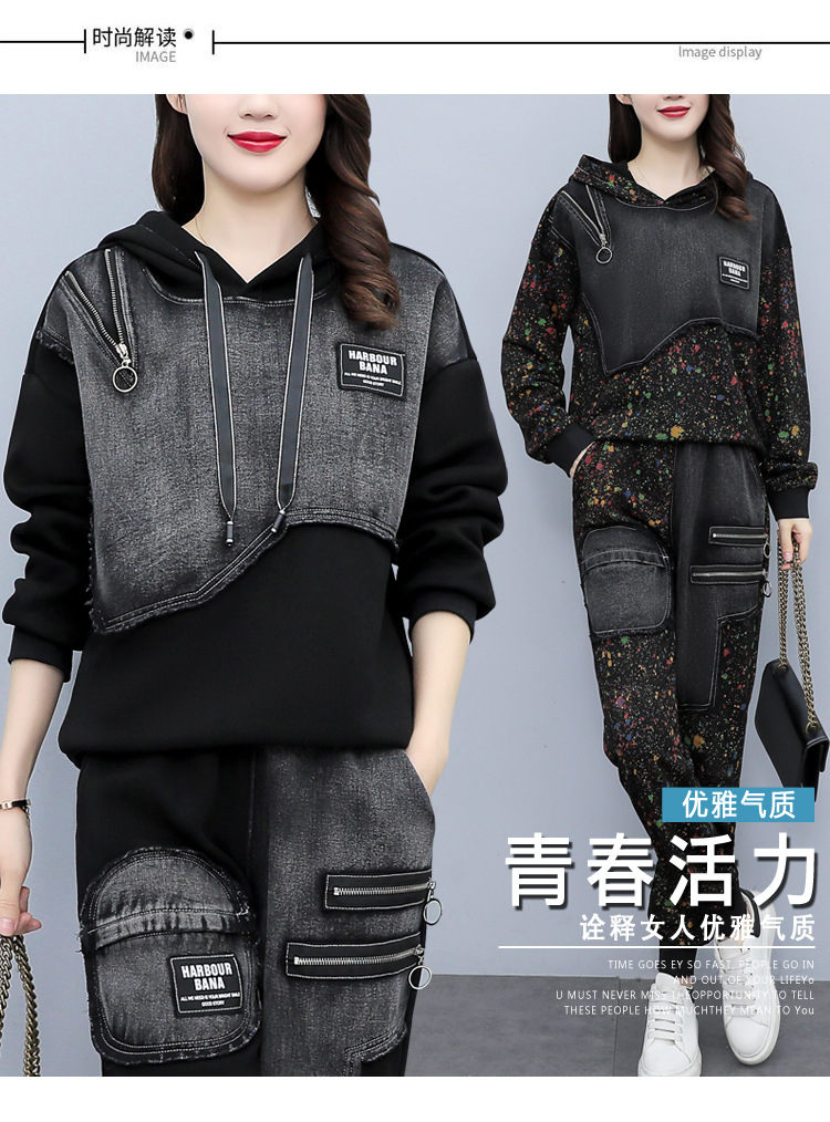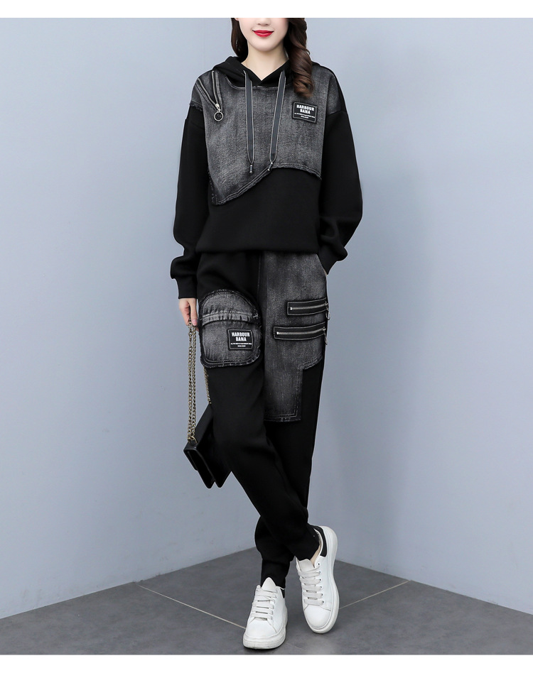 유럽 역 2023 봄과 가을 새로운 패션 세트 여성 스티치 데님 후드 스웨터 바지 투피스 패션 브랜드스토어 가기