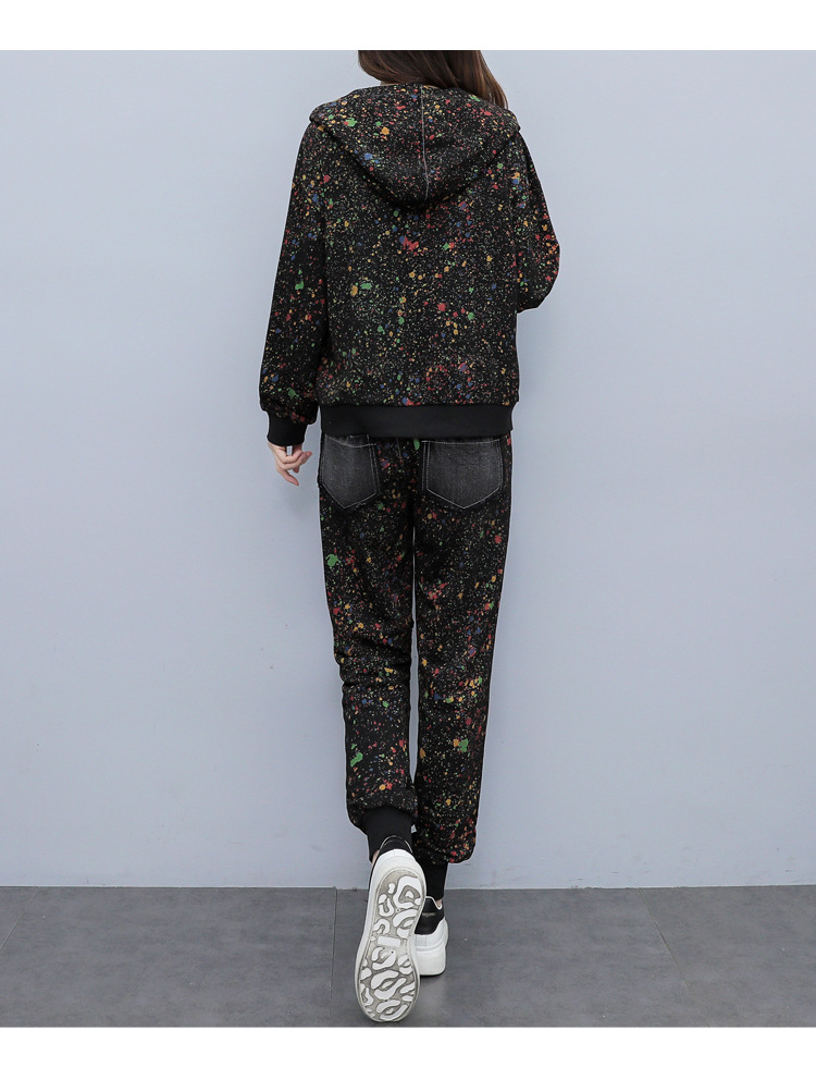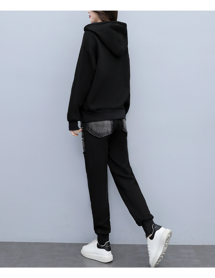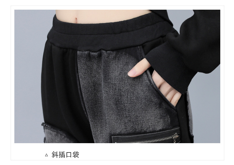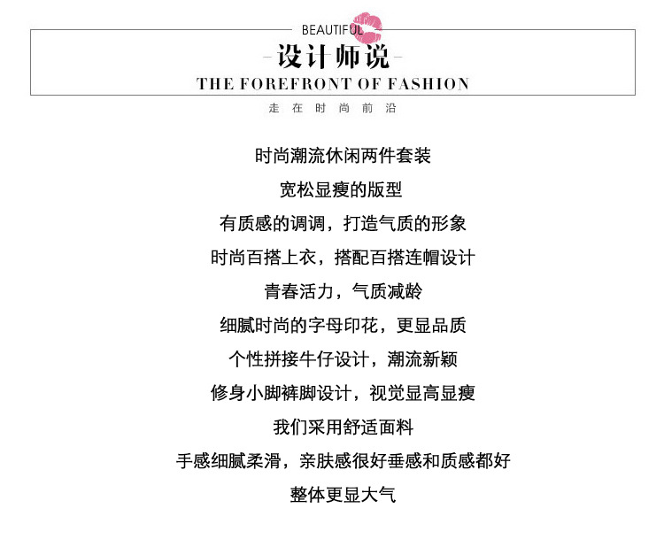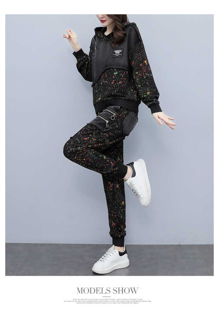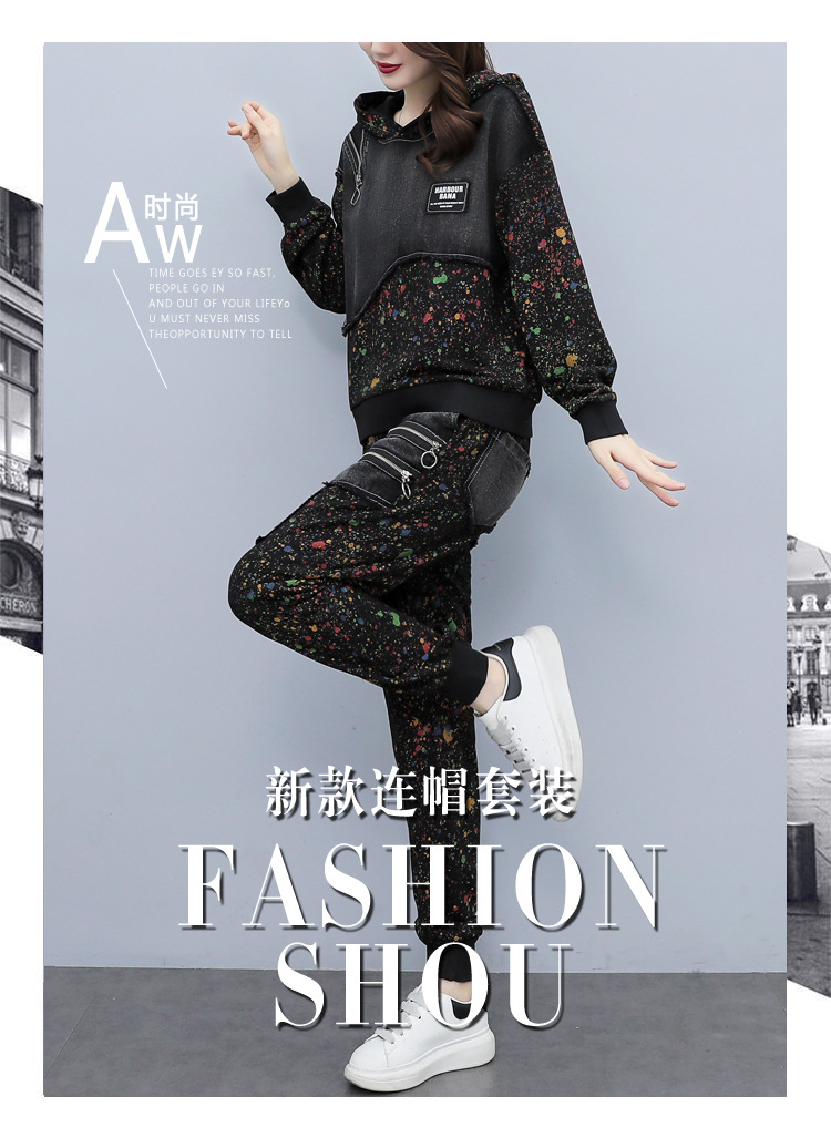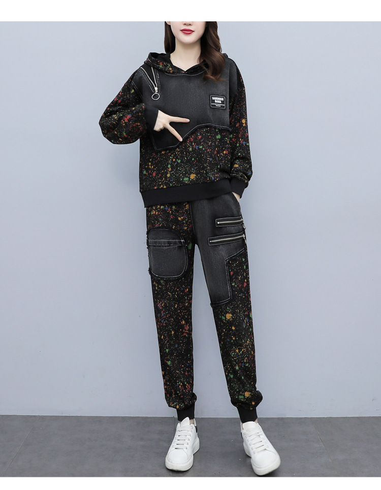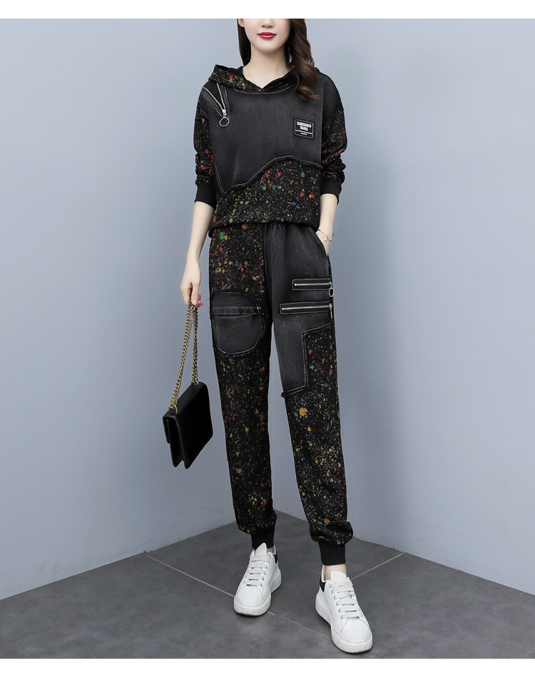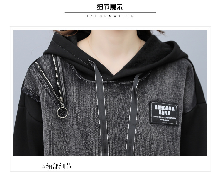 유럽 역 2023 봄과 가을 새로운 패션 세트 여성 스티치 데님 후드 스웨터 바지 투피스 패션 브랜드스토어 가기