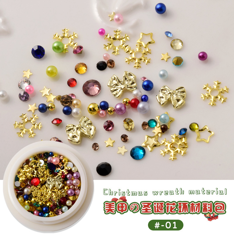 네일 아트 크리스마스 진주 보석 화환 소재 가방 골든 보우 스타 눈송이 다이아몬드 네일 다이아몬드 세트스토어 가기