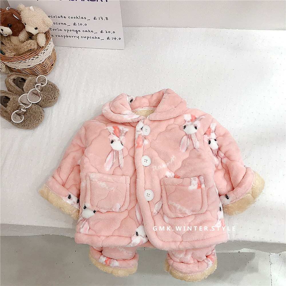 어린이 가정 의류 겨울 면 따뜻한 플란넬 세트 아기의 3 단 두꺼운 긴팔 바지 잠옷 투피스 세트