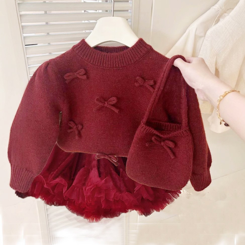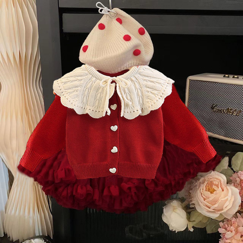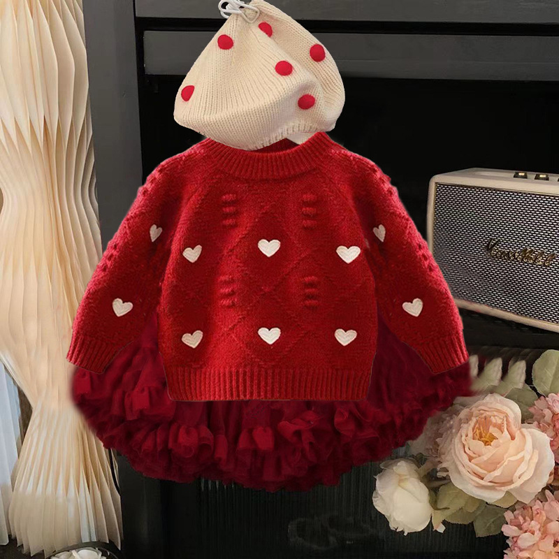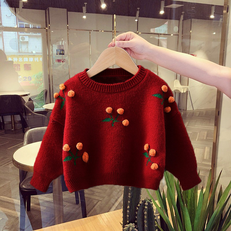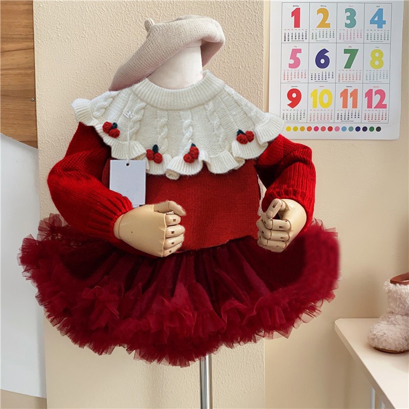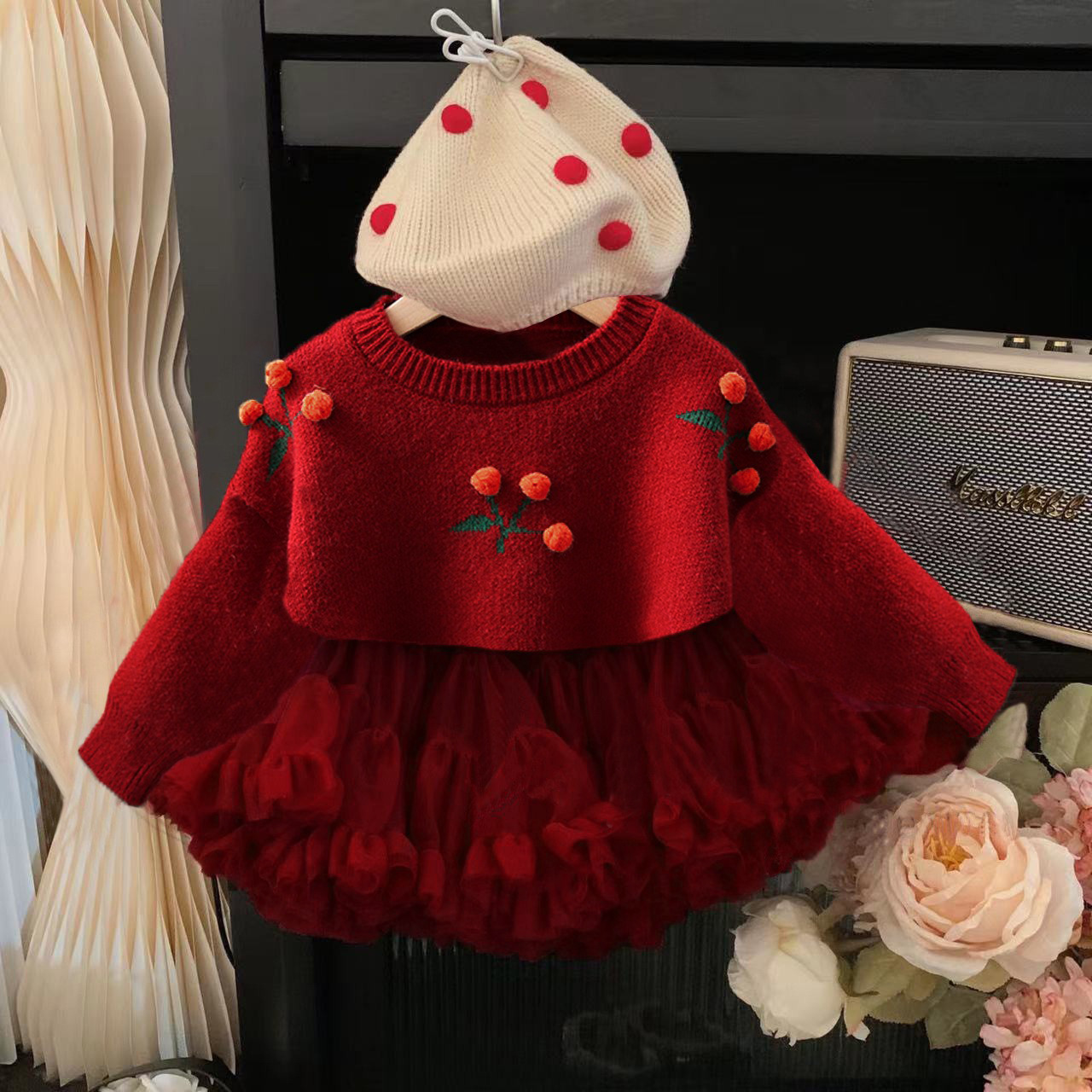 가을과 겨울 아동복 새로운 여아 레드 스웨터 니트 작은 체리 니트 셔츠 아기 투투 스커트스토어 가기