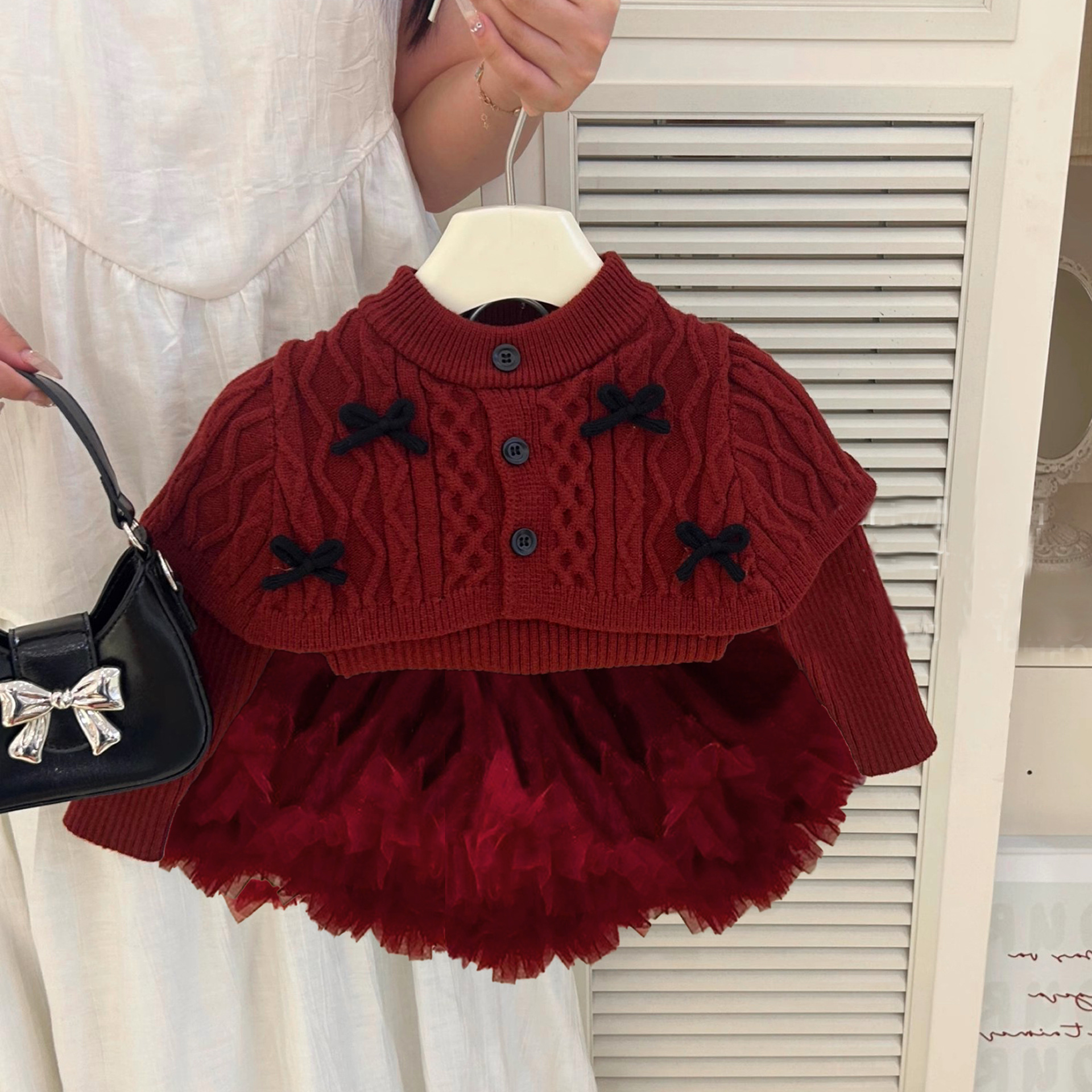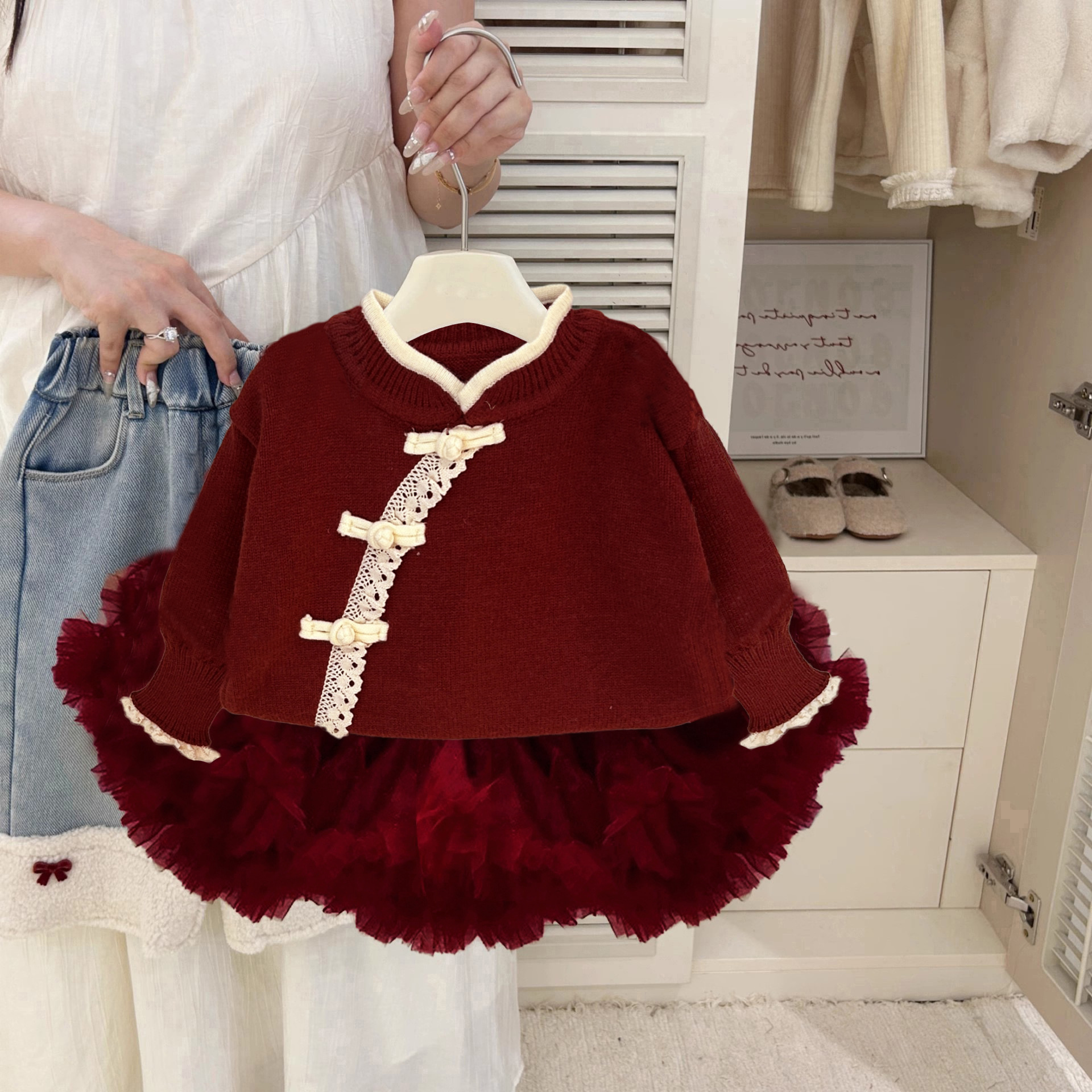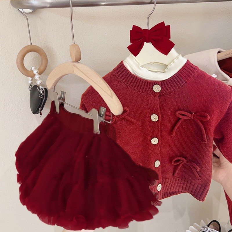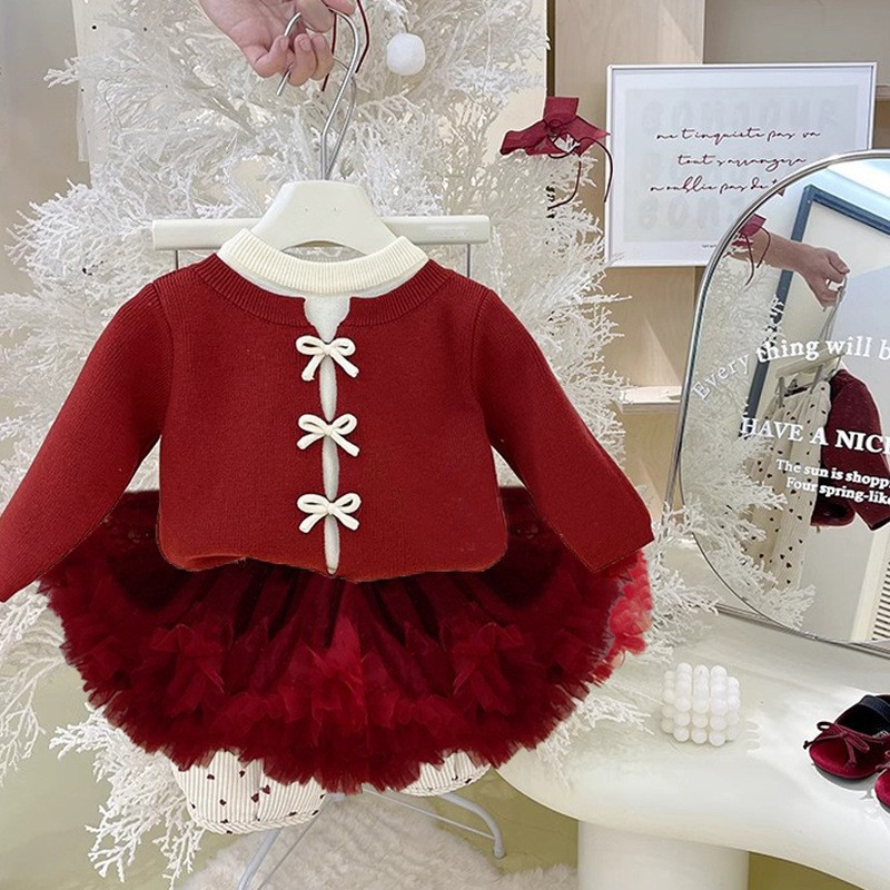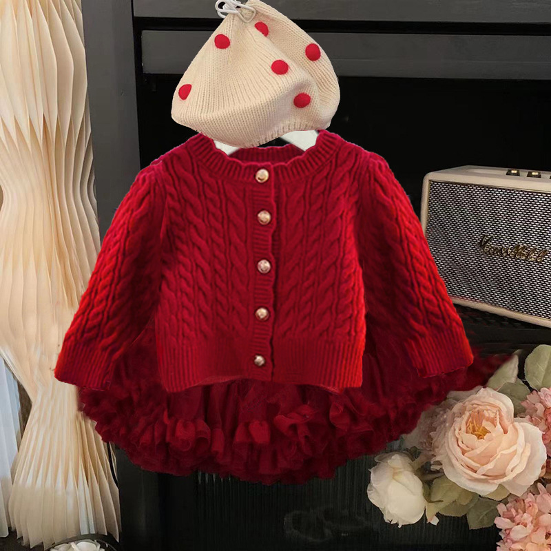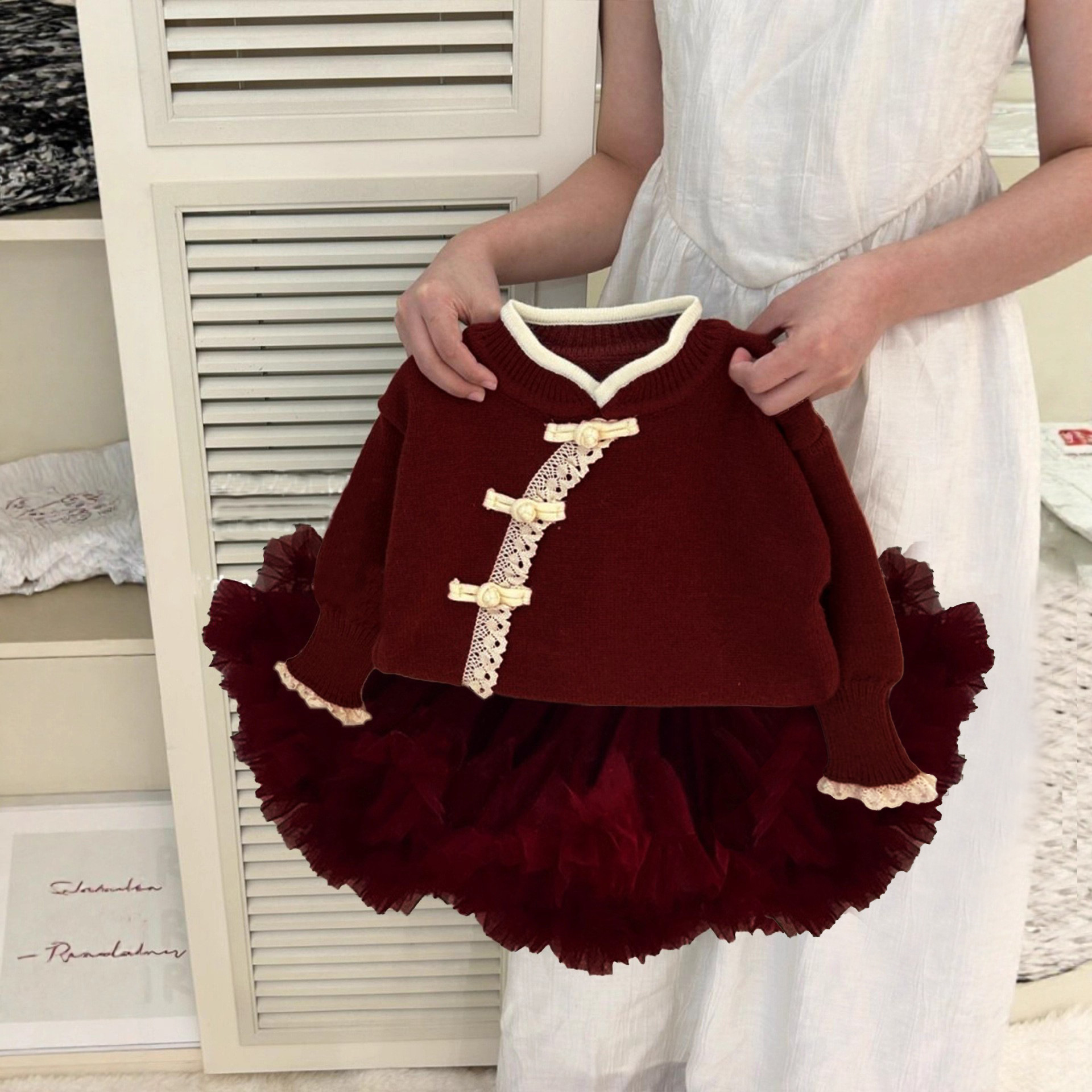 가을과 겨울 아동복 새로운 여아 레드 스웨터 니트 작은 체리 니트 셔츠 아기 투투 스커트스토어 가기