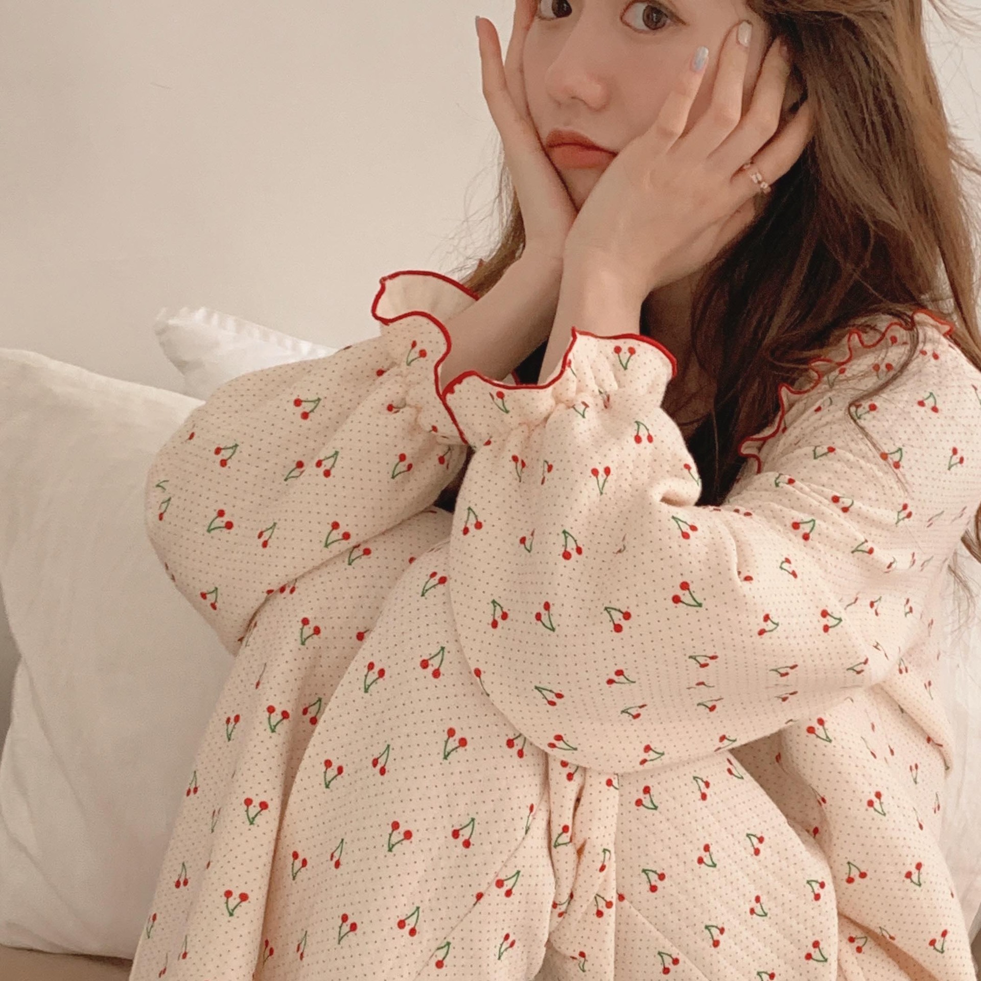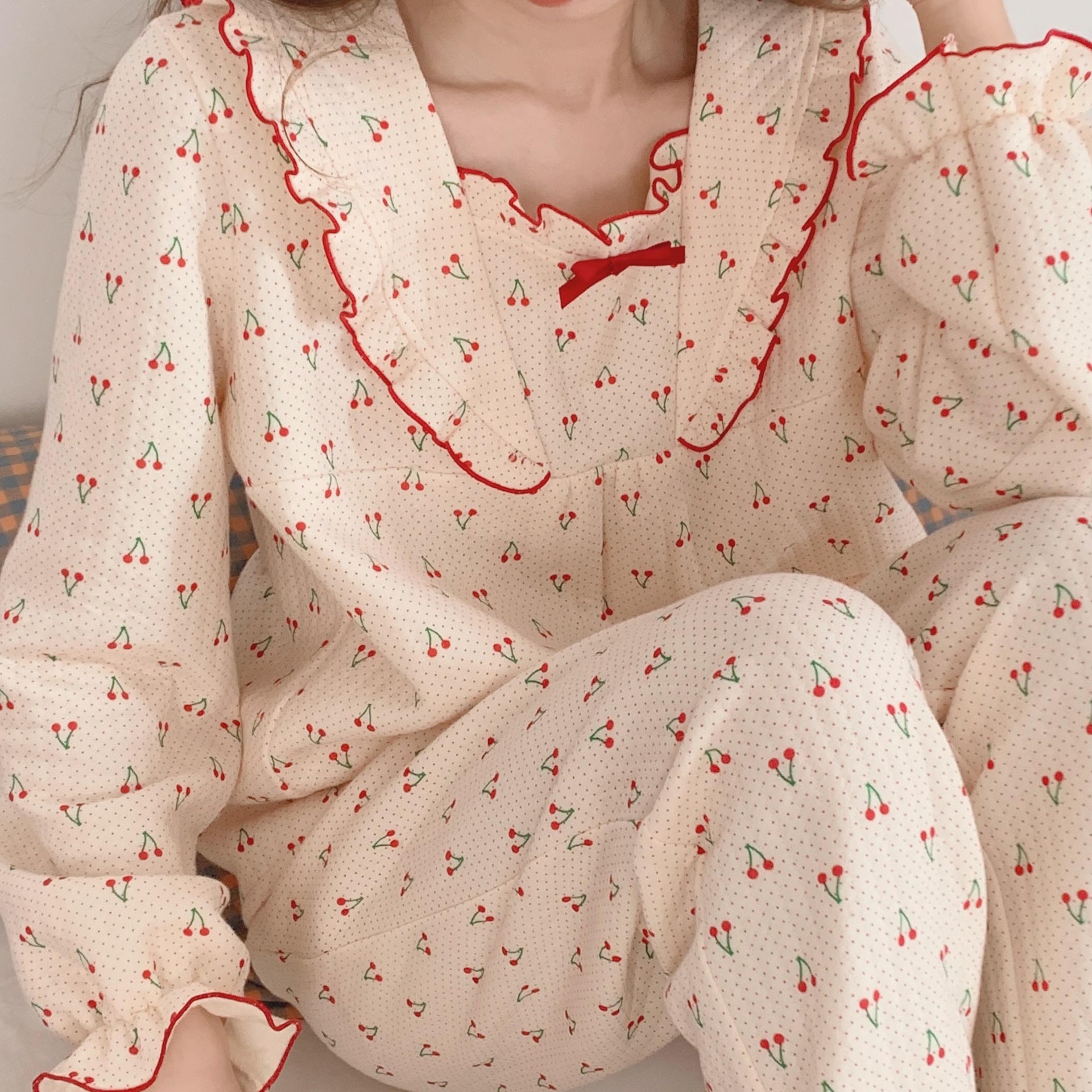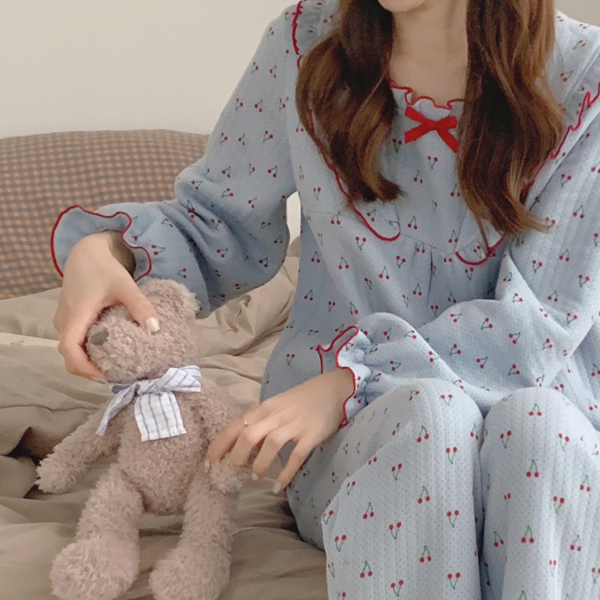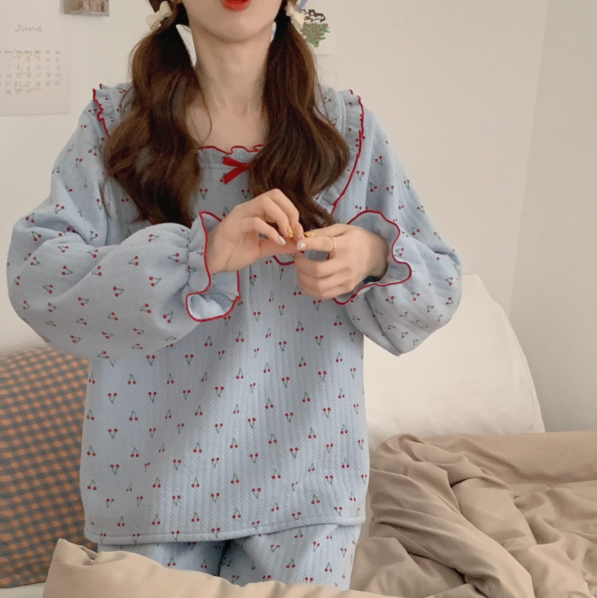 가을 잠옷 여성 가을과 겨울 긴팔 느슨한 봄과 가을 일본식 면 패딩 두꺼운 에어 코튼 홈 의류 투피스 세트