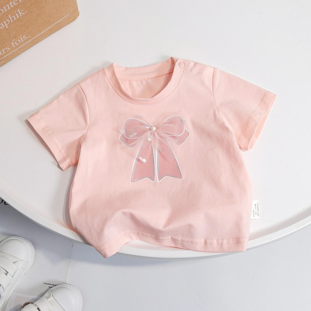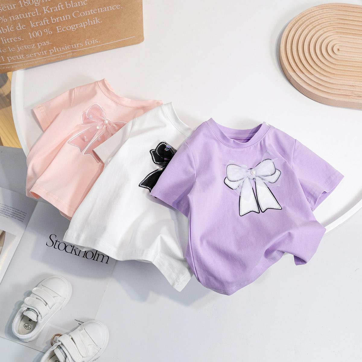 여아 2022 새로운 여름 한국식 반팔 티셔츠 세련된 서양식 귀여운 활 여성용 베이비 탑