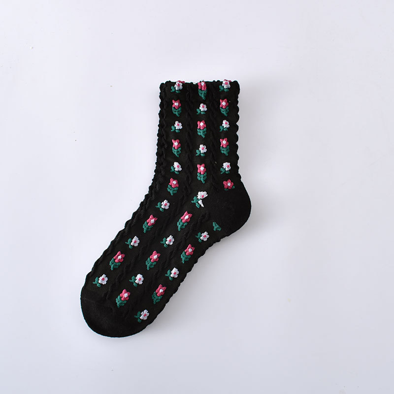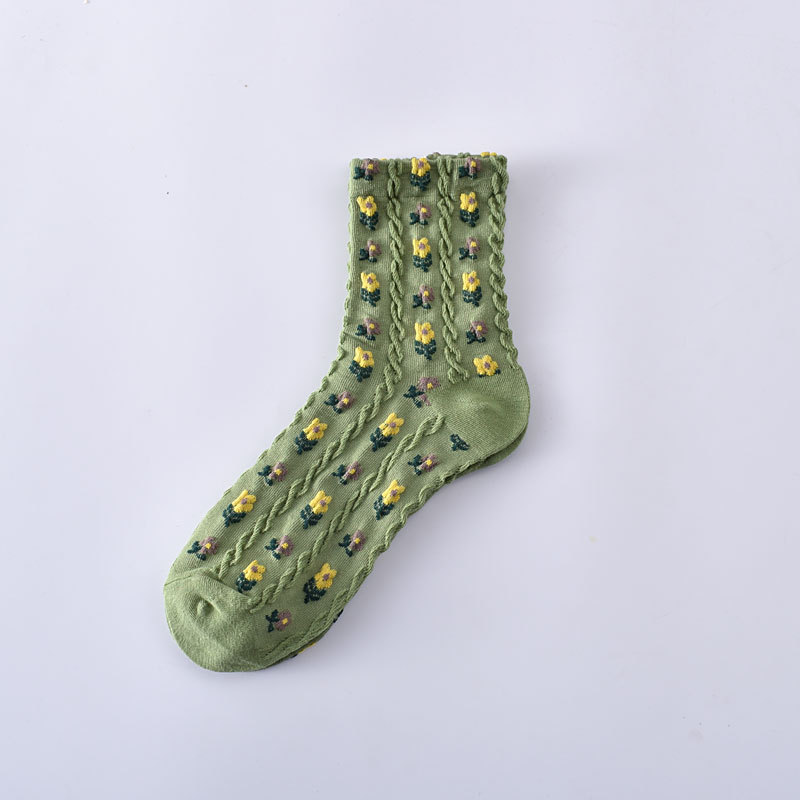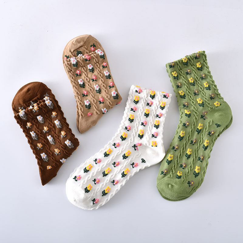 Liaoyuan Qiao 브랜드 양말 여성용 코튼 미드 배럴 인 트렌디 한 올 매치 입체 릴리프 가을과 겨울 스몰 플로럴 캐주얼