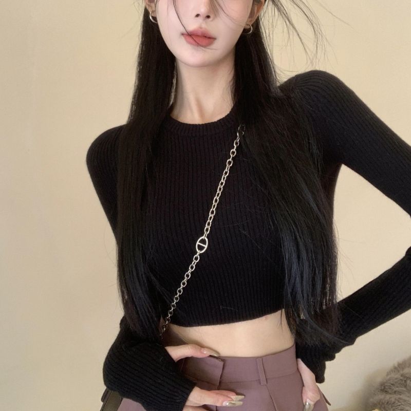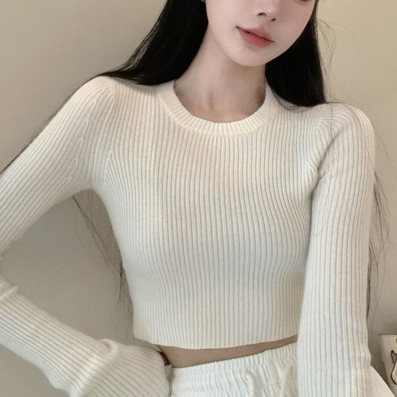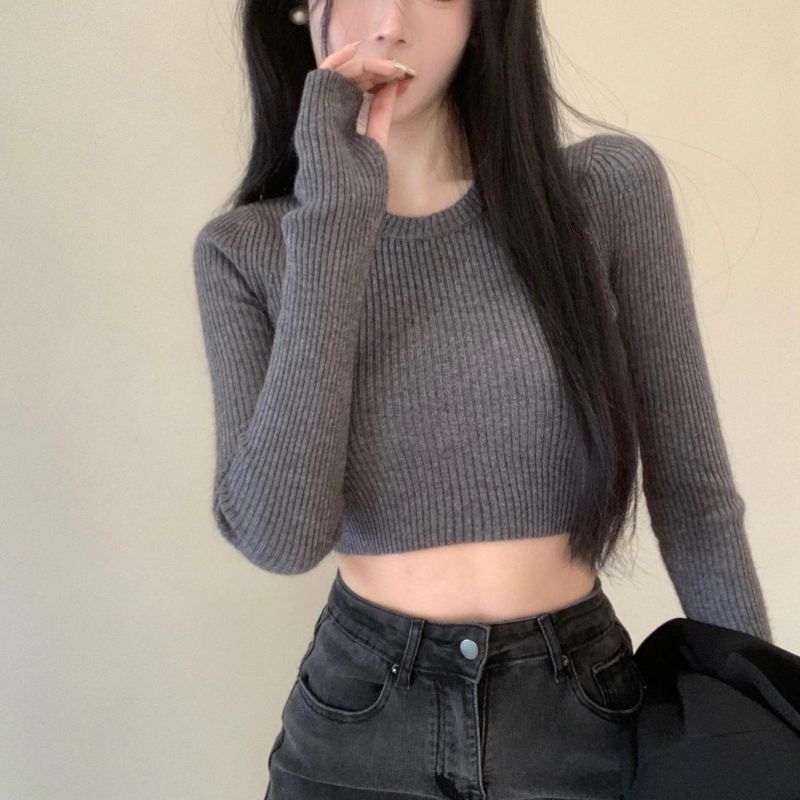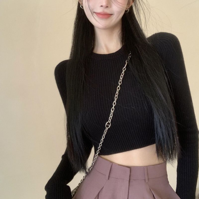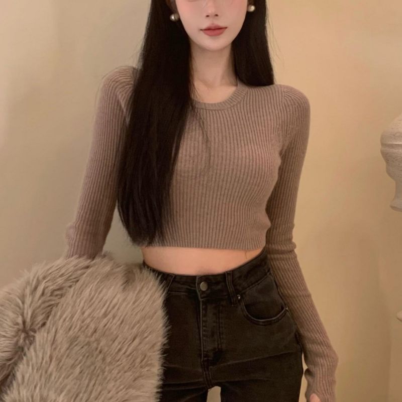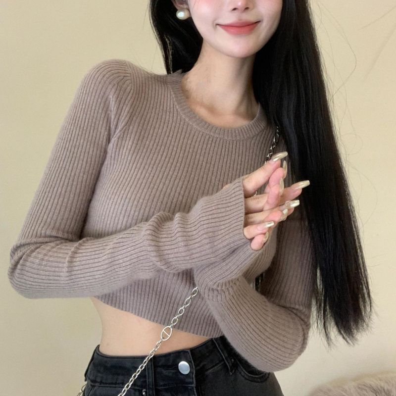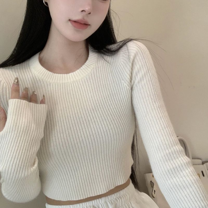 베이스 셔츠 여성용 스웨터 캐주얼 모든 매치 라운드 넥 여성용 스웨터 슬림핏 솔리드 컬러 쇼트 탑 여성 의류스토어 가기