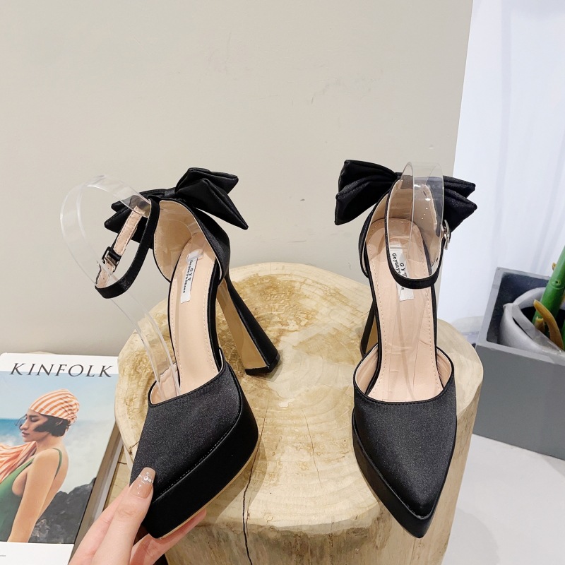 2025 여름 새로운 유럽과 미국의 패션 새틴 하이힐 샌들 활 한 단어 버클 지적 발가락 두꺼운 뒤꿈치 여성 신발스토어 가기