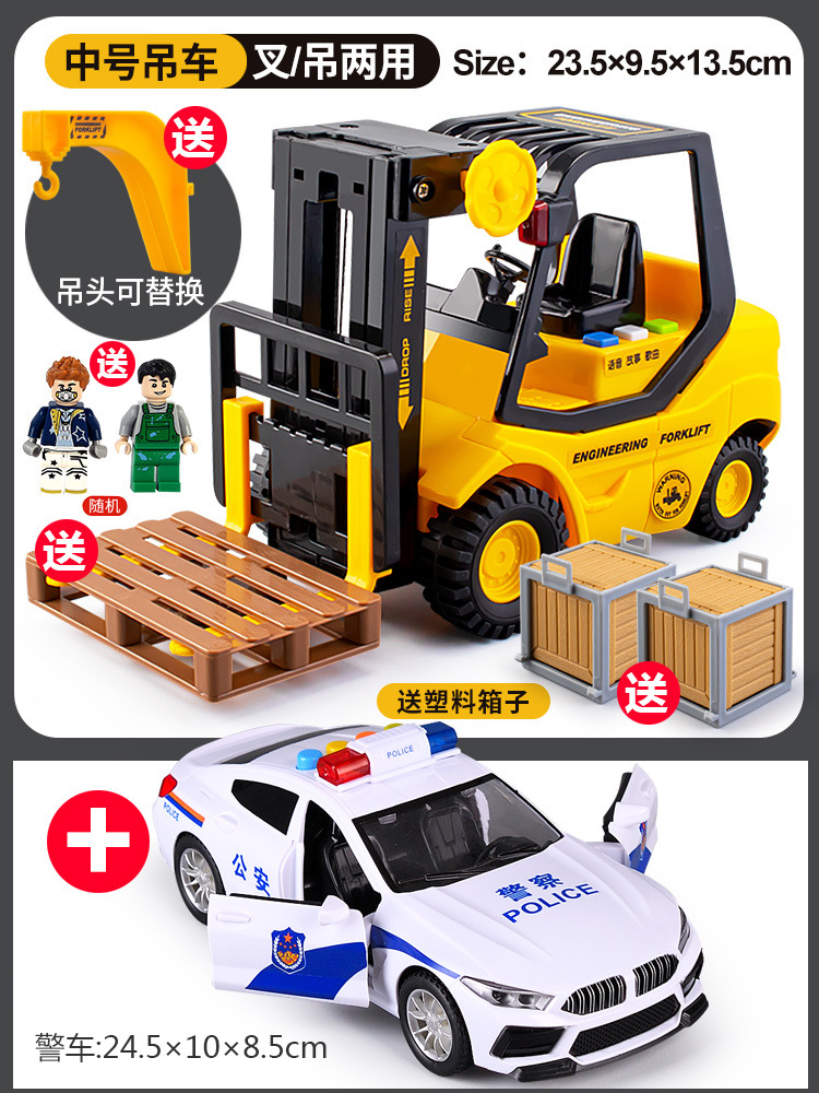 • 음악 지게차 + 대형 경찰차 [인형 2 개 + 하드 박스 2 개 + 후크 + 포크 플레이트 보내기]]
