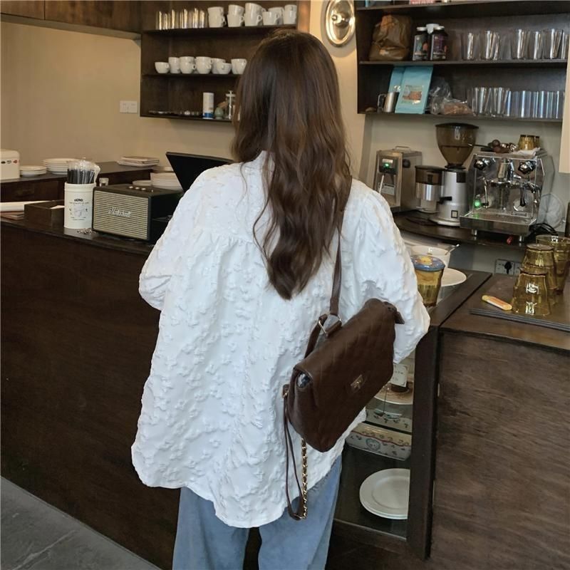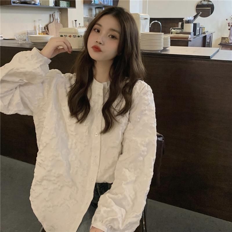 재고 화이트 셔츠 여자의 2022 봄 부드러운 스타일 레이스 디자인 외국 스타일 버블 긴 소매 셔츠 최고 여성