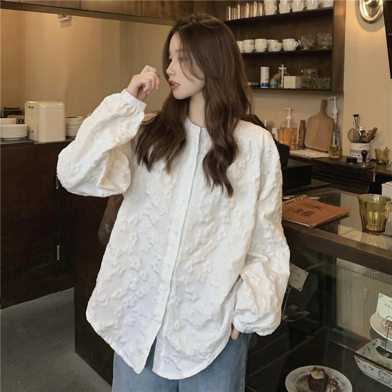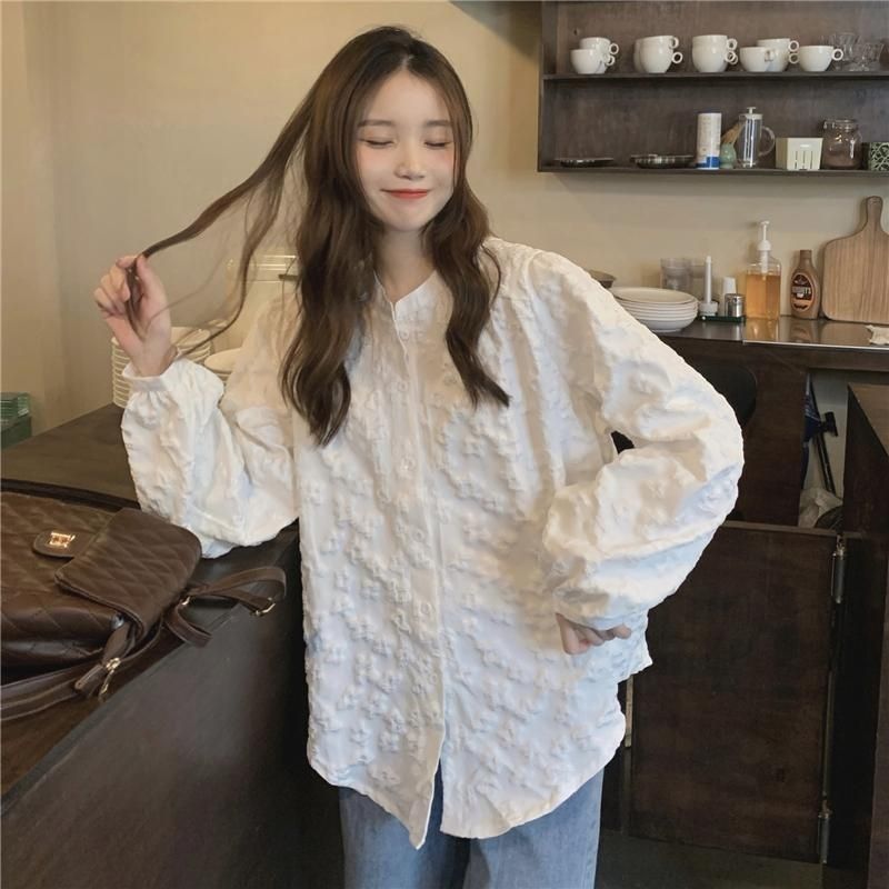 재고 화이트 셔츠 여자의 2022 봄 부드러운 스타일 레이스 디자인 외국 스타일 버블 긴 소매 셔츠 최고 여성스토어 가기
