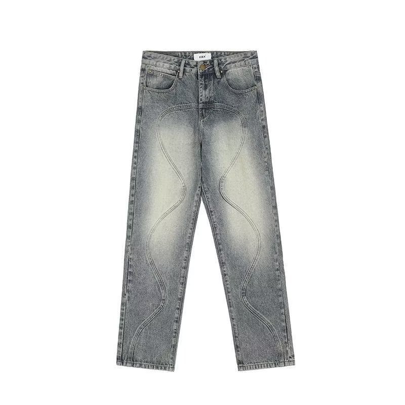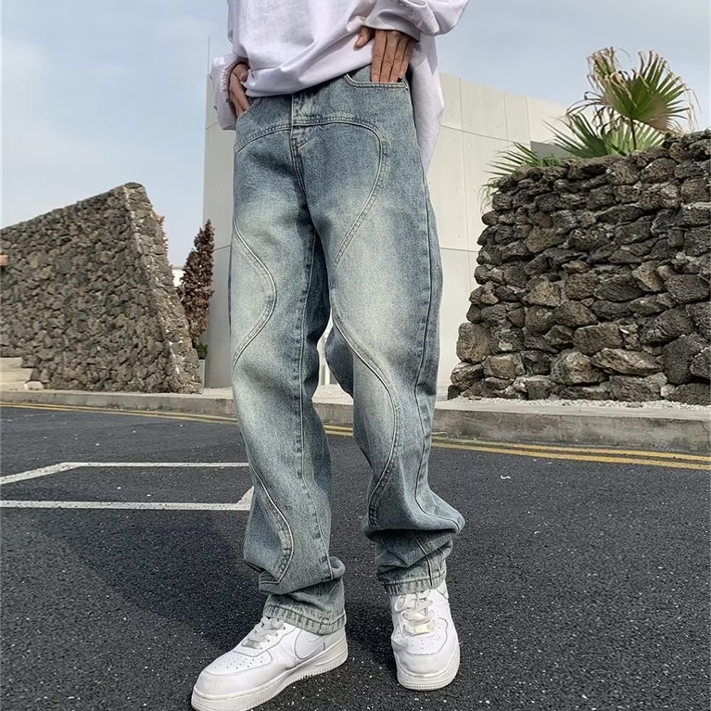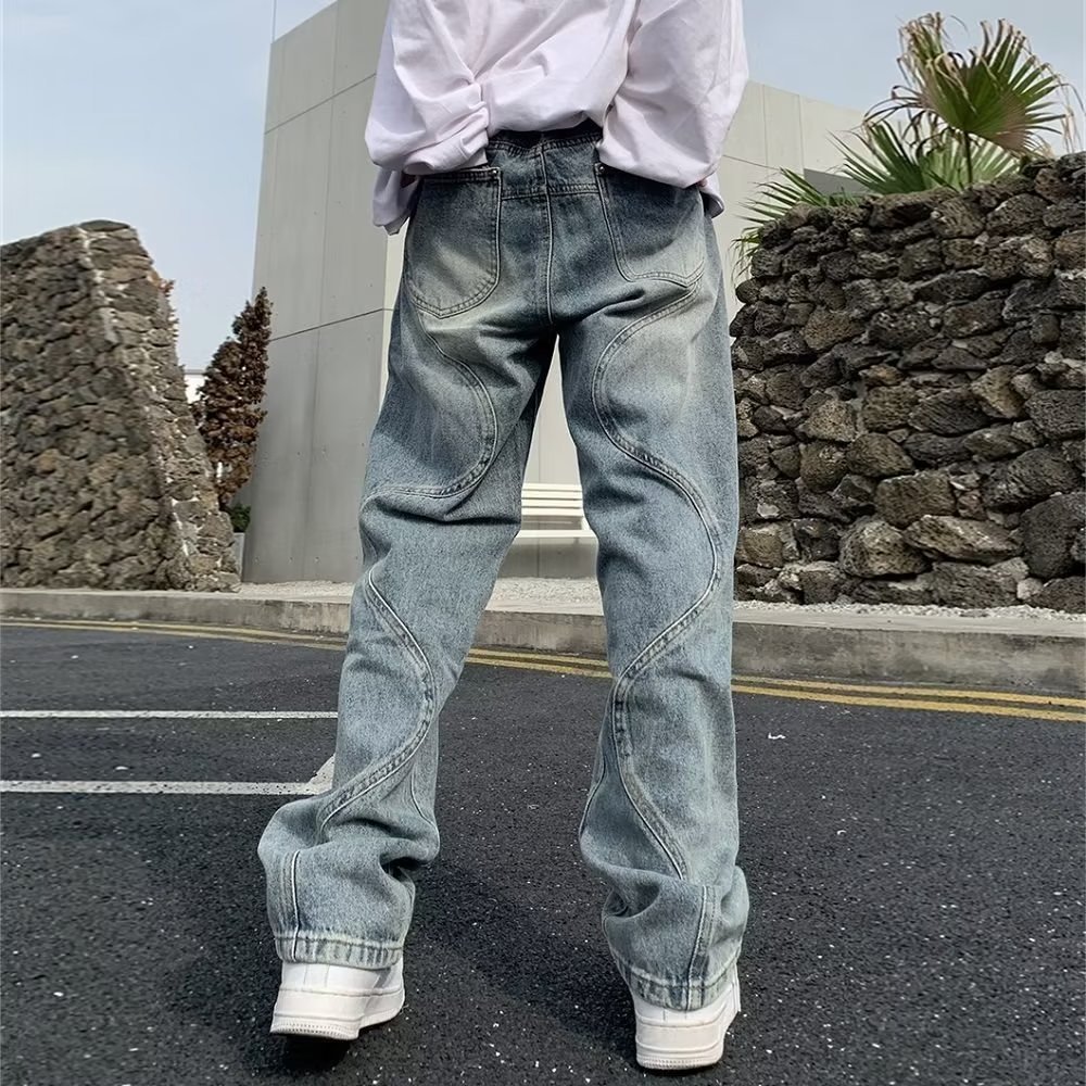 레트로 향수 하이 스트리트 청바지 바지 슬림핏 느슨한 발 블루 INS 청바지 트렌디 한 남성용 원피스 헤어