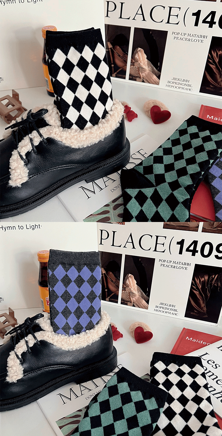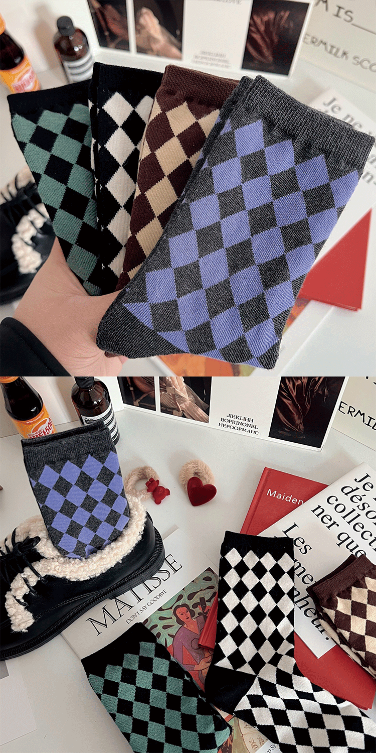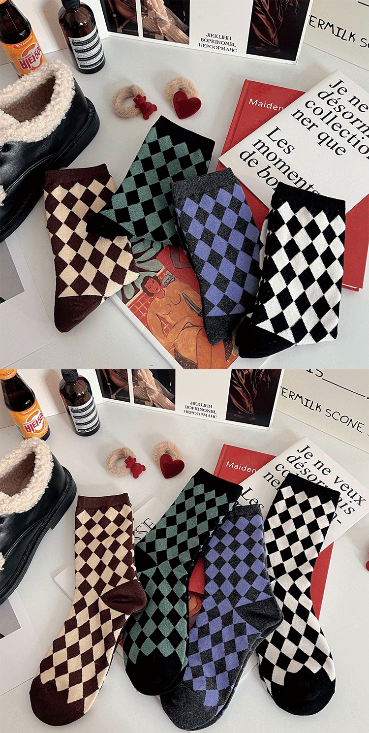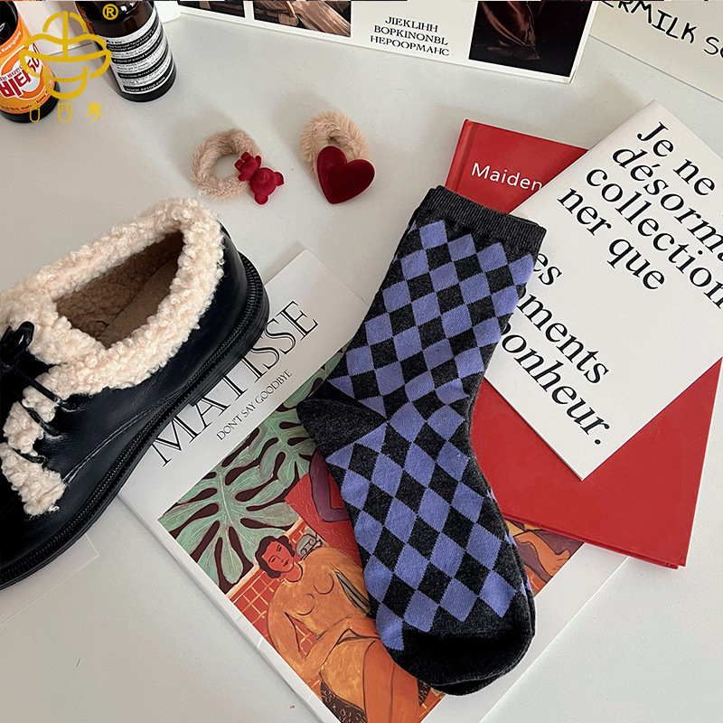 Ji Four 코끼리 양말 여성용 가을과 겨울 새로운 한국식 격자 무늬 중간 길이 양말 빗질 면 올매치 트렌디 브랜드 여성 양말 학생 면 양말스토어 가기